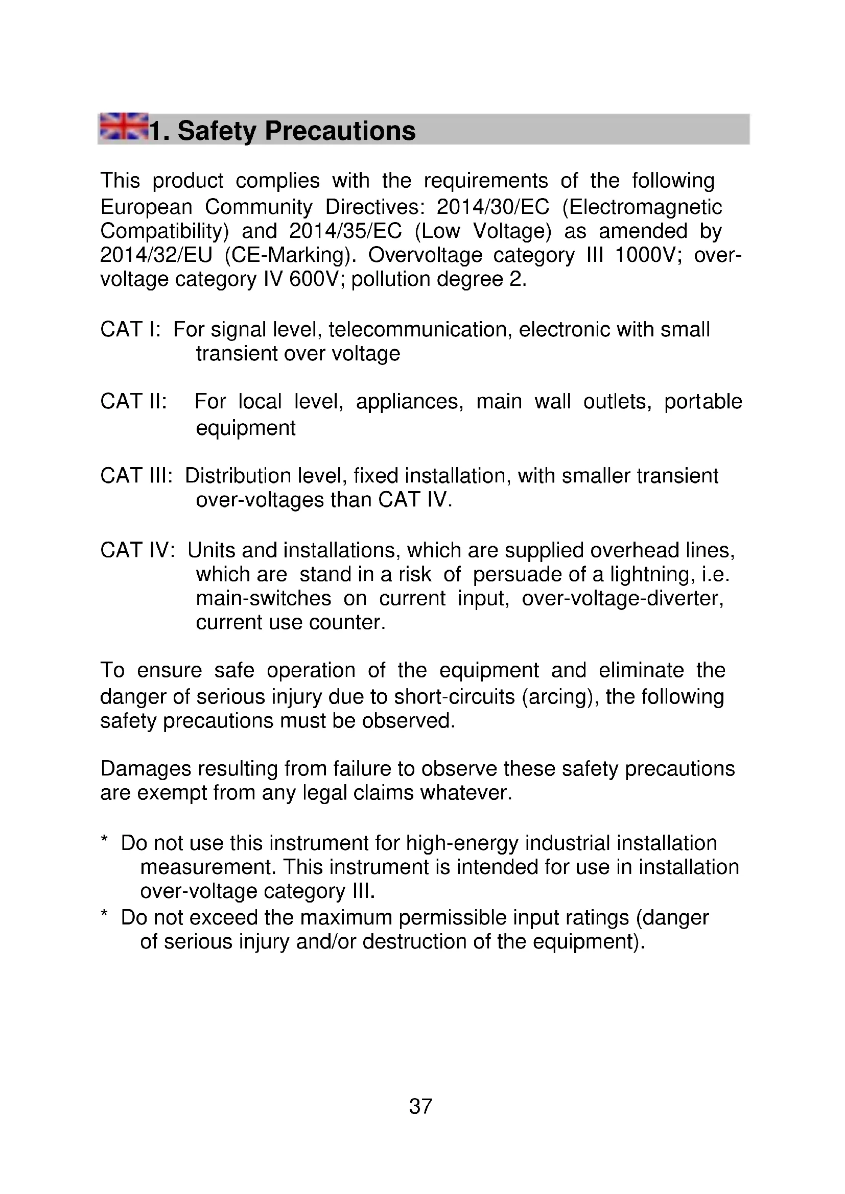 This product complies with the requirements of the following European Community Directives: 2014/30/EC (Electromagnetic Compatibility) and 2014/35/EC (Low Voltage) as amended by 2014/32/EU (CE-Marking). Overvoltage category III 1000V; over- voltage category IV 600V; pollution degree 2. CAT I: For signal level, telecommunication, electronic with small transient over voltage CAT II: For local level, appliances, main wall outlets, portable equipment CAT III: Distribution level, fixed installation, with smaller transient over-voltages than CAT IV. CAT IV: Units and installations, which are supplied overhead lines, which are stand in a risk of persuade of a lightning, i.e. main-switches on current input, over-voltage-diverter, current use counter. To ensure safe operation of the equipment and eliminate the danger of serious injury due to short-circuits (arcing), the following safety precautions must be observed. Damages resulting from failure to observe these safety precautions are exempt from any legal claims whatever.