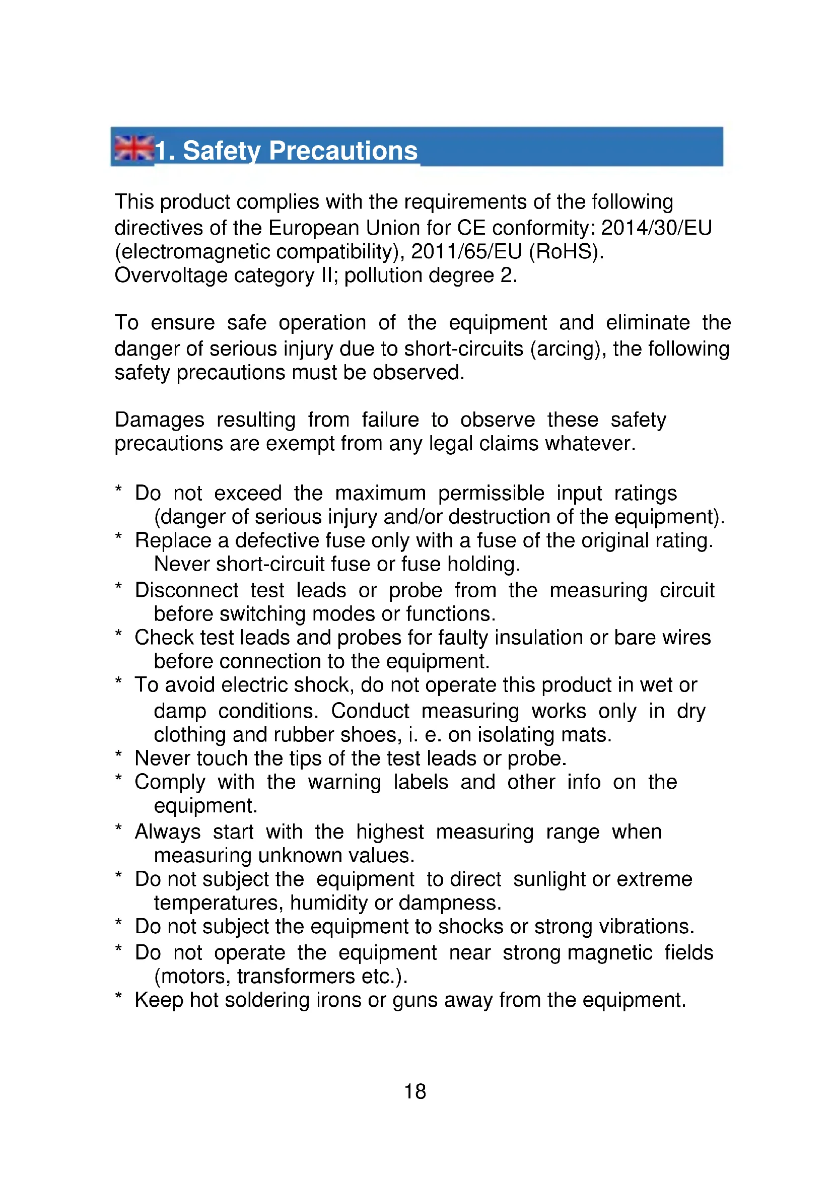 This product complies with the requirements of the following directives of the European Union for CE conformity: 2014/30/EU (electromagnetic compatibility), 2011/65/EU (RoHS). Overvoltage category II; pollution degree 2. To ensure safe operation of the equipment and eliminate the danger of serious injury due to short-circuits (arcing), the following safety precautions must be observed. Damages resulting from failure to observe these safety precautions are exempt from any legal claims whatever.