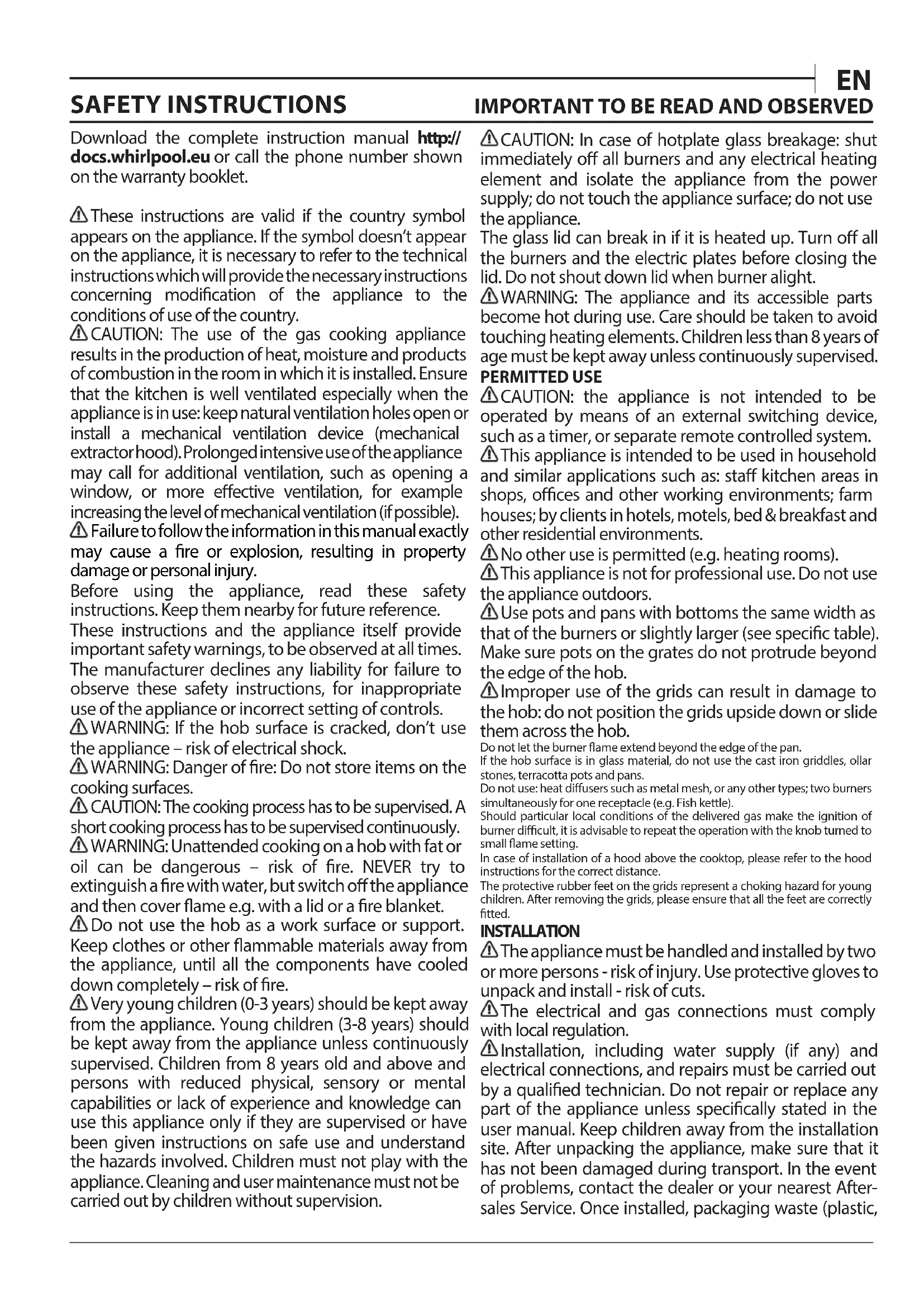 Download the complete instruction manual http:// docs.whirlpool.eu or call the phone number shown on the warranty booklet. These instructions are valid if the country symbol appears on the appliance. If the symbol doesn’t appear on the appliance, it is necessary to refer to the technical instructions which will provide the necessary instructions concerning modication of the appliance to the conditions of use of the country. CAUTION: The use of the gas cooking appliance results in the production of heat, moisture and products of combustion in the room in which it is installed. Ensure that the kitchen is well ventilated especially when the appliance is in use: keep natural ventilation holes open or install a mechanical ventilation device (mechanical extractor hood). Prolonged intensive use of the appliance may call for additional ventilation, such as opening a window, or more eective ventilation, for example increasing the level of mechanical ventilation (if possible). Failure to follow the information in this manual exactly may cause a re or explosion, resulting in property damage or personal injury. Before using the appliance, read these safety instructions. Keep them nearby for future reference. These instructions and the appliance itself provide important safety warnings, to be observed at all times. The manufacturer declines any liability for failure to observe these safety instructions, for inappropriate use of the appliance or incorrect setting of controls.