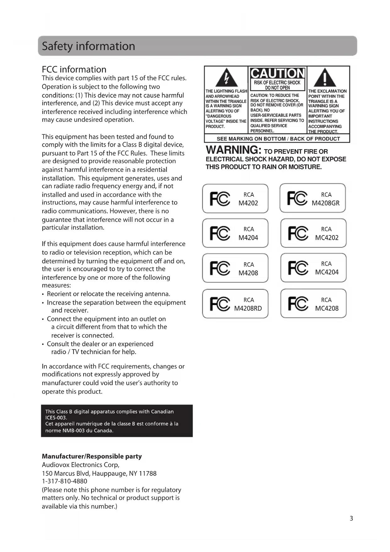 ELECTRICAL SHOCK HAZARD, DO NOT EXPOSE THIS PRODUCT TO RAIN OR MOISTURE. This Class B digital apparatus complies with Canadian ICES-003. Cet appareil numérique de la classe B est conforme à la norme NMB-003 du Canada. Manufacturer/Responsible party Audiovox Electronics Corp, 150 Marcus Blvd, Hauppauge, NY 11788 1-317-810-4880 (Please note this phone number is for regulatory matters only. No technical or product support is available via this number.) RCA M4208RD RCA M4208GRSafety information