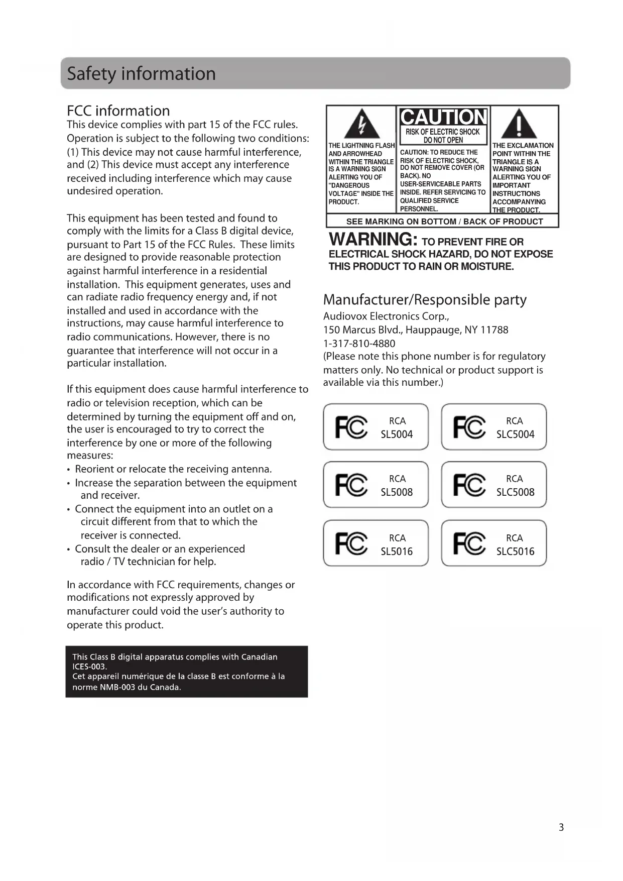ELECTRICAL SHOCK HAZARD, DO NOT EXPOSE THIS PRODUCT TO RAIN OR MOISTURE. This Class B digital apparatus complies with Canadian ICES-003. Cet appareil numérique de la classe B est conforme à la norme NMB-003 du Canada. Manufacturer/Responsible party Audiovox Electronics Corp., 150 Marcus Blvd., Hauppauge, NY 11788 1-317-810-4880 (Please note this phone number is for regulatory matters only. No technical or product support is available via this number.) RCA SL5016 RCA SLC5016Safety information
