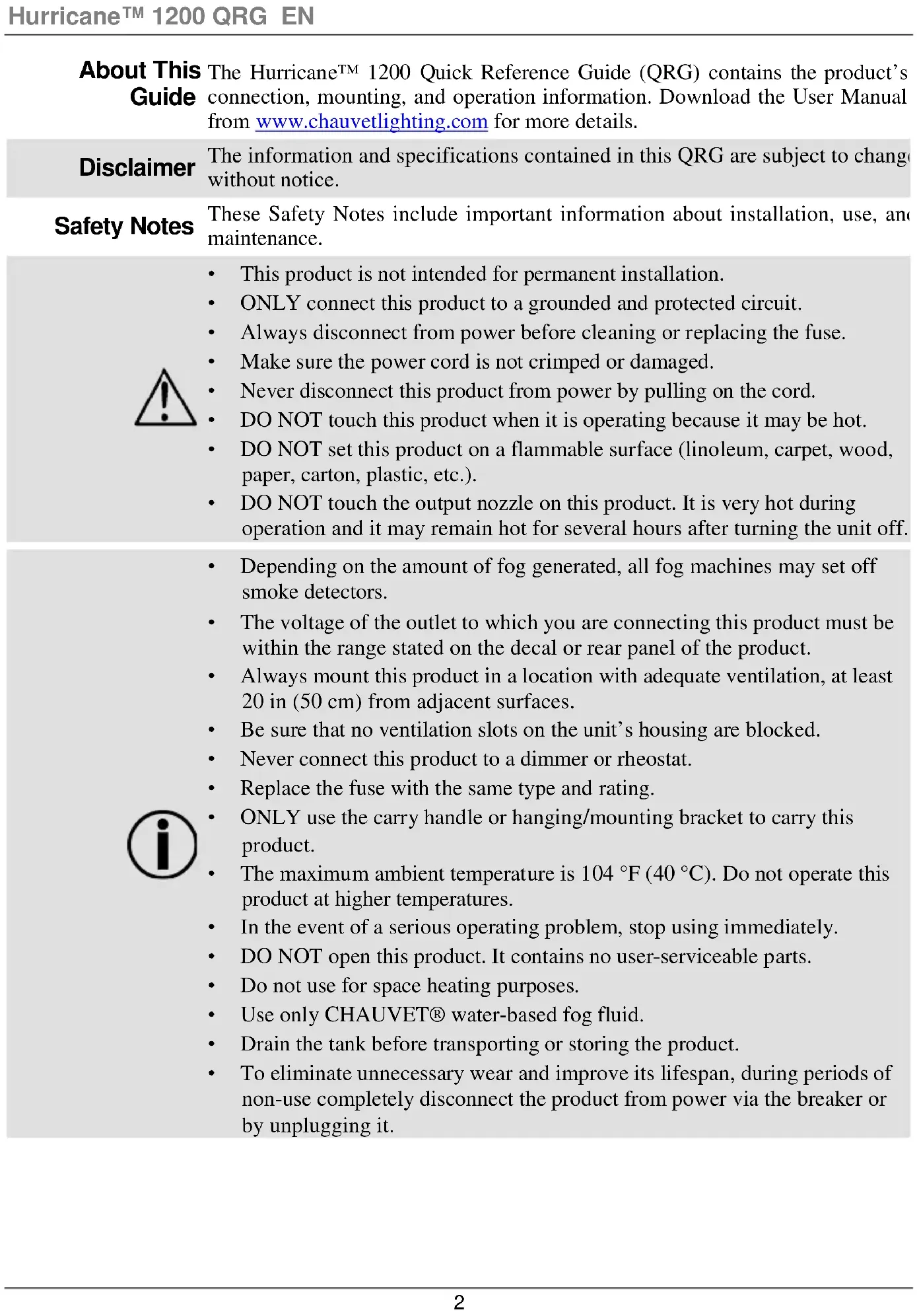 The Hurricane™ 1200 Quick Reference Guide (QRG) contains the product’s connection, mounting, and operation information. Download the User Manual from www.chauvetlighting.com for more details. Disclaimer