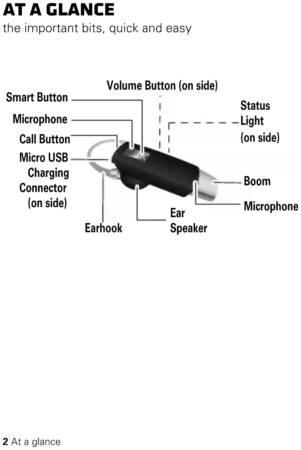 - Safety, Regulatory & Legal more information On the web: www.motorola.com/support Caution: Please read the important safety, regulatory and legal information at the back of this guide.2 At a glance At a glance the important bits, quick and easy Smart Button Earhook Micro USB Charging Connector (on side) Microphone Volume Button (on side) Ear Speaker Boom Microphone Call Button Status Light (on side)3Charge it Charge it let’s get you up and running While your headset is charging, you won’t be able to use it. Note: Your battery is designed to last the life of your product. It should only be removed by a recycling facility. Any attempt to remove or replace your battery will damage your headset. Status Light Red/Yellow = charging Green = fully charged4 Connect & go Connect & go let’s get you connected There are two methods to pair your headset and phone—EasyPair and NFC (Near Field Communication). When your headset successfully pairs with your phone, you hear “pairing complete”. When connected, you hear “phone 1 connected” and the indicator light rapidly flashes blue and purple. Easypair method 1 Turn off any Bluetooth devices previously paired with your headset. 2 Turn on the Bluetooth feature on your phone. 3 Put the headset on your ear (see “Comfort” on page 7 for help) and turn on (see “Turn on & off” on page 6 for help). The indicator light becomes steadily lit in blue and you hear “Welcome to the Motorola Elite Flip. Ready to pair”. 4 Follow the voice prompts to connect your phone to your headset. Note: If prompted for the passkey, enter 0000.5Connect & go NFC method Using NFC (Near Field Communication), pairing is as simple as bringing the headset and phone close to each other. Note: If your phone does not support NFC, use the “Easypair method” on page 4. To pair and connect your headset with your phone, ensure your phone’s display is on and touch the top of the headset to your phone’s NFC tag location. Hold the headset to the phone until NFC pairing completes p. 17