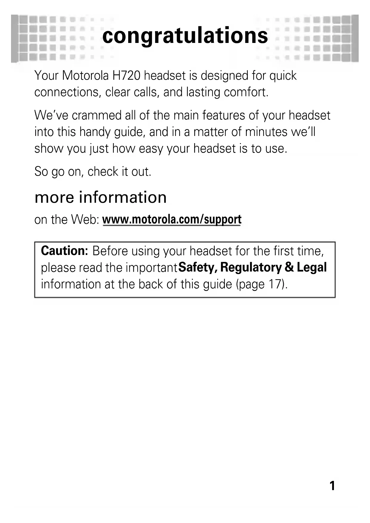 congra tulatio ns Your Motorola H720 headset is designed for quick connections, clear calls, and lasting comfort. We’ve crammed all of the main features of your headset into this handy guide, and in a matter of minutes we’ll show you just how easy your headset is to use. So go on, check it out. more information on the Web: www.motorola.com/support Caution: Before using your headset for the first time, please read the important Safety, Regulatory & Legal information at the back of this guide (page 17).your headset