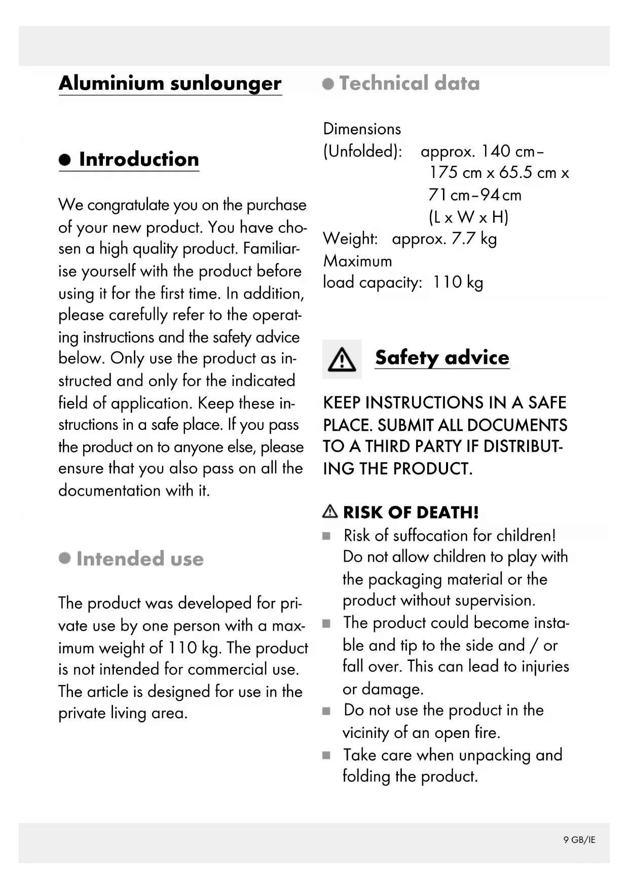 ING THE PRODUCT. RISK OF DEATH! Risk of suffocation for children! Do not allow children to play with the packaging material or the product without supervision. The product could become insta- ble and tip to the side and / or fall over. This can lead to injuries or damage. Do not use the product in the vicinity of an open fire. Take care when unpacking and folding the product.10 GB/IE Ensure the correct stability has been achieved before using the article. Ensure that the product is standing on a stable, level surface. Observe the maximum load ca- pacity of 110 kg. If the weight limit is exceeded, this can lead to product damage and / or injuries. Keep your hands out of the fold- ing mechanism in order to avoid the risk of injury. Ensure that the folding function is correctly locked before using the article. Ensure that the article has been fully opened before using the article. The article may only be used with adult supervision and may not be used as a toy. The article may only be used by one person at a time. Check the product before each use for damage or wear. Only use the product if in perfect con- dition! Do not use the product if there is visible or suspected damage. Secure the product in extreme weather conditions e.g. strong winds. Store the product in pro- tected rooms. Do not stand on the product.