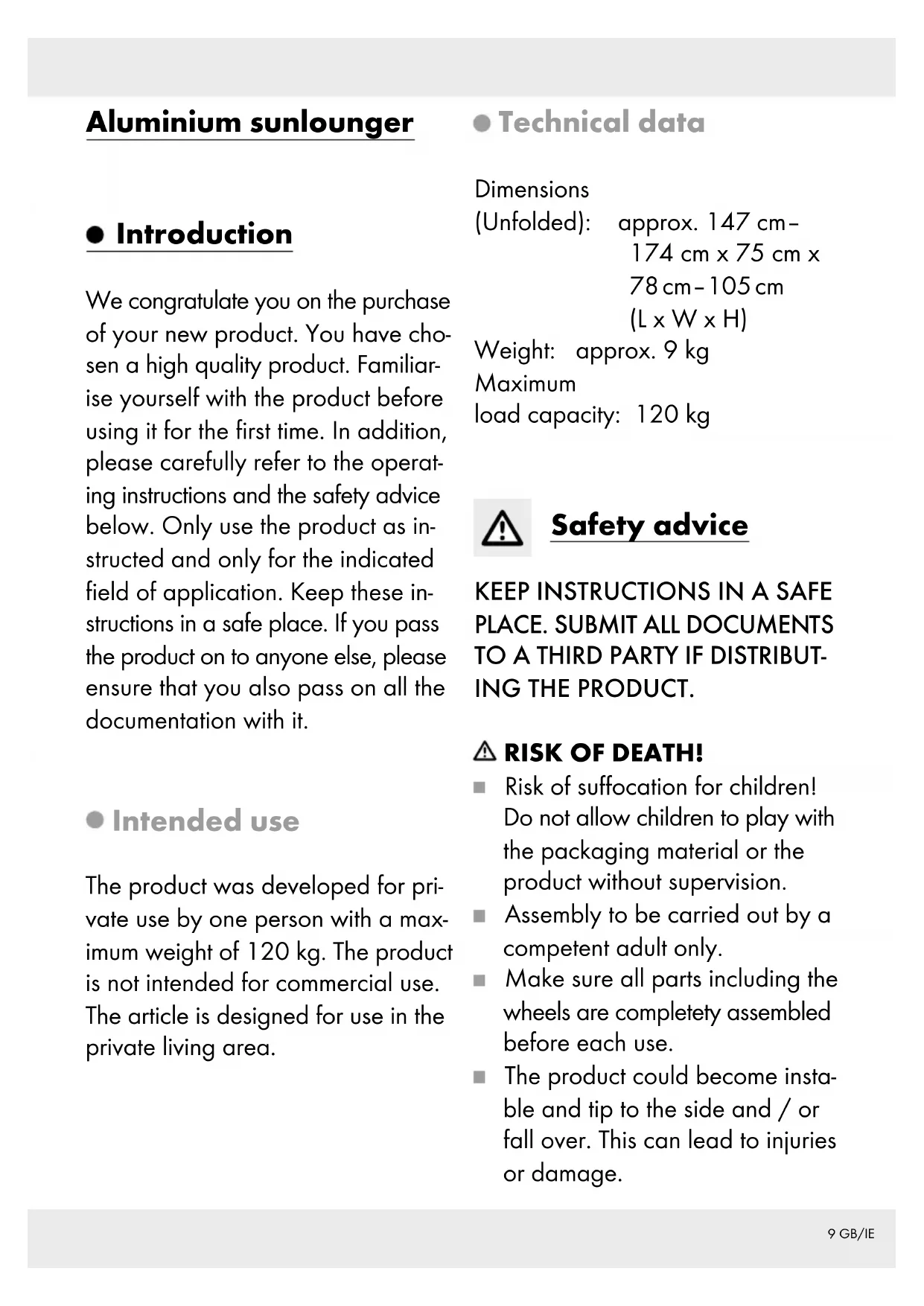 PROPERTY! We are not liable for accidents that occur as a result of non-ob- servance of the above safety n otes or through incorrect handling. Cleaning and care For cleaning and the removal of any stains you should only use damp cloth and a mild detergent, which is specifically designated for use with this product. Remove dirt from the product with a soft sponge and clean water. Allow all parts to dry thoroughly before you pack the product up again. This will prevent the for- mation of moulds, odours and discolouration. Storage We recommend that you always store the article in a dry, clean and11 GB/IE temperature-controlled room in order to enjoy it for as long as possible. Disposal The packaging is made entirely of recyclable materials, which you may dispose of at local recycling facilities. Contact your local refuse disposal authority for more details of how to dispose of your worn-out product. Warranty The product has been manufactured to strict quality guidelines and me- ticulously examined before delivery. In the event of product defects you have legal rights against the retail- er of this product. Your legal rights are not limited in any way by our warranty detailed below. The warranty for this product is 3 years from the d ate of purchase. The war- ranty period begins on the date of purchase. Please keep the original sales receipt in a safe location. This document is required as your proof of purchase. Should this product show any fault in materials or manufacture within 3 years from the date of purchase, we will repair or replace it – at our choice – free of charge to you. This warranty becomes void if the prod- uct has been damaged, or used or maintained improperly. The warranty applies to defects in material or manufacture. This war- ranty does not cover product parts subject to normal wear, thus possi- bly considered consumables (e.g. batteries) or for damage to fragile parts, e.g. switches, rechargeable batteries or glass parts. Warranty claim procedure To ensure quick processing of your case, please observe the following instructions: Please have the till receipt and the item number (e.g. IAN 123456_7890) available as proof of purchase. You will find the item number on the rating plate, an engraving on the front page of the instructions for use12 GB/IE (bottom left), or as a sticker on the rear or bottom of the product. If functional or other defects occur, please contact the service depart- ment listed either by telephone or by e-mail. You can return a defective product to us free of charge to the service address that will be provided to you. Ensure that you enclose the proof of purchase (till receipt) and infor- mation about what the defect is and when it occurred. Service Service Great Britain Tel.: 08000569216 E-Mail: owim@lidl.co.uk Service Ireland Tel.: 1800 200736 E-Mail: owim@lidl.ie13 FR/BE Chaise longue en aluminium Introduction Nous vous félicitons pour l‘achat de votre nouveau produit. Vous avez opté pour un produit de grande qualité. Avant la première mise en service, vous devez vous familiariser avec toutes les fonctions du produit. Veuillez lire attentivement le mode d’emploi ci-dessous et les consignes de sécurité. N’utilisez le produit que pour l’usage décrit et les domaines d’application cités. Conserver ces instructions dans un lieu sûr. Si vous donnez le produit à des tiers, re- mettez-leur également la totalité des documents. Utilisation conforme Ce produit est uniquement destiné à l‘usage privé, pour des personnes d‘un poids max. de 120 kg. Ce produit n‘est pas destiné à un usage commercial. Ce produit a été conçu pour les espaces d‘habitation privés. Caractéristiques techniques Dimensions (déplier) : env. 147 cm‒ 174 cm x 75 cm x 78 cm‒105 cm (l x H x P) Poids : env. 9 kg Charge max. : 120 kg Consignes de sécurité CONSERVER SOIGNEUSEMENT