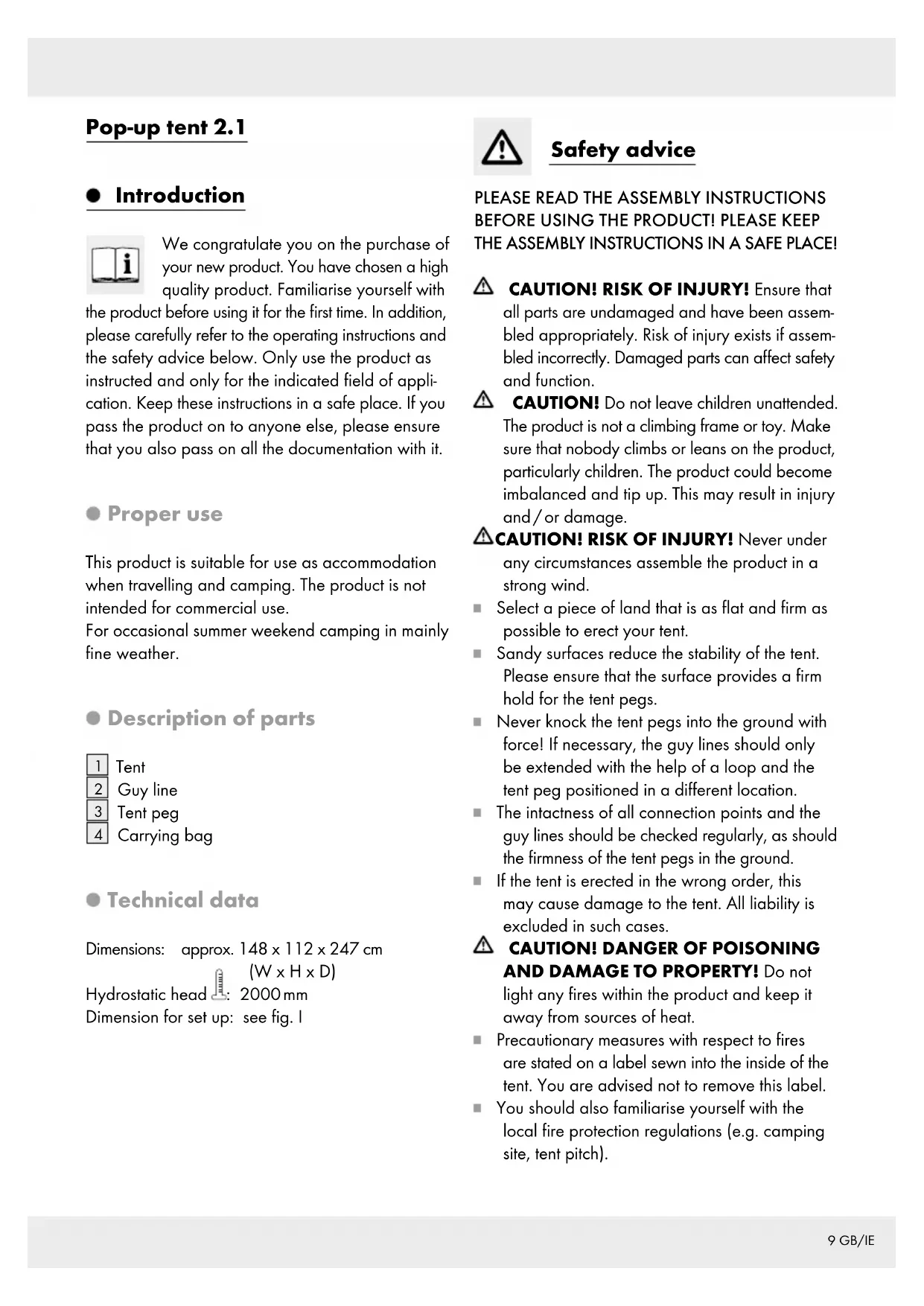 AND DAMAGE TO PROPERTY! Do not light any fires within the product and keep it away from sources of heat. Precautionary measures with respect to fires are stated on a label sewn into the inside of the tent. You are advised not to remove this label. You should also familiarise yourself with the local fire protection regulations (e.g. camping site, tent pitch).10 GB/IE Make sure ventilation openings (includes the outer door) are open all the time to avoid suffocation. Keep the exit free! Do not block the exit with objects. DANGER OF SUFFOCATION! If the inside of the tent is not adequately venti- lated, there is a risk of suffocation. Fire precautions Camp safely. Follow these common sense rules: Do not place hot appliances near the walls, roof or curtains. Always observe the safety instructions for these appliances. Never allow children to play near hot appliances. Keep exits clear. Do not block the exit with objects. Make sure you know the fire precaution arrange- ments on the site. Take note of the effects of the weather and climate When selecting the location to put up your tent, you should always consider the local situation and how this might change. Will the terrain turn into a lake if it rains? Please take into account any rising rivers and incoming tides. Protect the product against strong wind and storms. Place the product in a location that is protected from the wind if possible. If a strong wind is forecast, replace the normal tent pegs with special storm pegs. You can find information about meaningful supplementary products at specialist shops. The tent should be taken down before heavy snowfall or stormy weather. Remove any snow directly from the product. Otherwise the product may collapse under the weight. Ensure that the tent is not too taut when it is erected, otherwise it may not be able to adapt to changing weather conditions and might be damaged. Zips are wearing parts and do not fall under the guarantee conditions. The polyester material of the tent consists of water-repellent material. It is possible that during the first rainfall the tent will not be completely watertight. However, the threads of the tent will contract when exposed to water so that after a short time the tent will become watertight. When exposed to moisture and rain, tent fabrics expand to varying degrees and make it neces- sary to adapt the length of the guy lines. If the material becomes taut again while drying, the guy lines have to be loosened again in good time. Do not use any insect spray in or on the tent. Small leaks on the seams can be repaired with a seam spray and impregnation spray can be used for the tent skin. Assembly Please ensure that the product is only assembled / disassembled by a competent person. Erecting the tent ATTENTION: Please note that the poles are under tension and snap into the natural shape of the tent. Taking care that the release of tension does not cause any injury. Remove the rubber band and throw the product away from you into the air. Set up the tent with guy lines