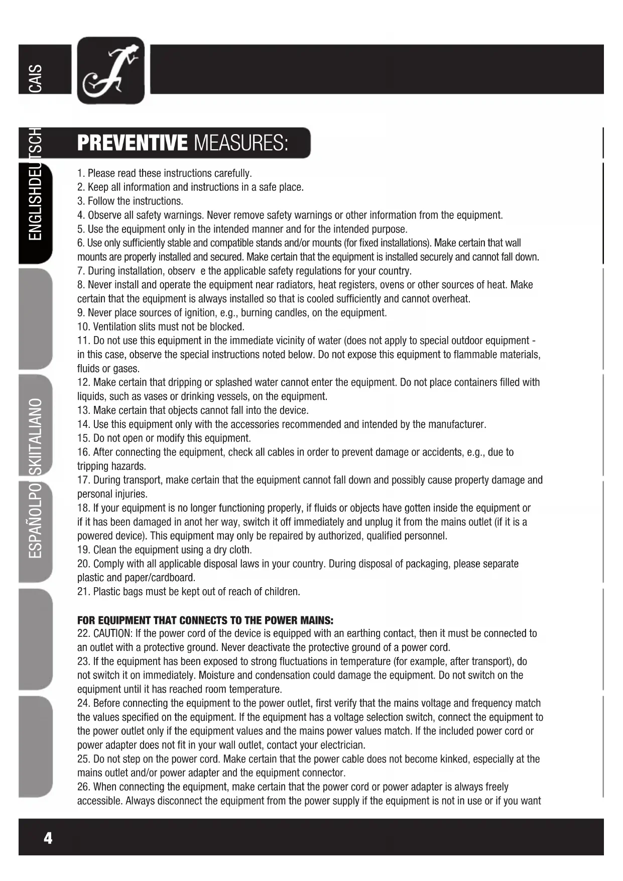 accessible. Always disconnect the equipment from the power supply if the equipment is not in use or if you want4 5 ITALIANO POLSKI ESPAÑOL FRANCAIS FRANCAIS FRANCAIS FRANCAIS FRANCAIS DEUTSCH ENGLISH SAFETY: to clean the equipment. Always unplug the power cord and power adapter from the power outlet at the plug or adapter and not by pulling on the cord. Never touch the power cord and power adapter with wet hands.