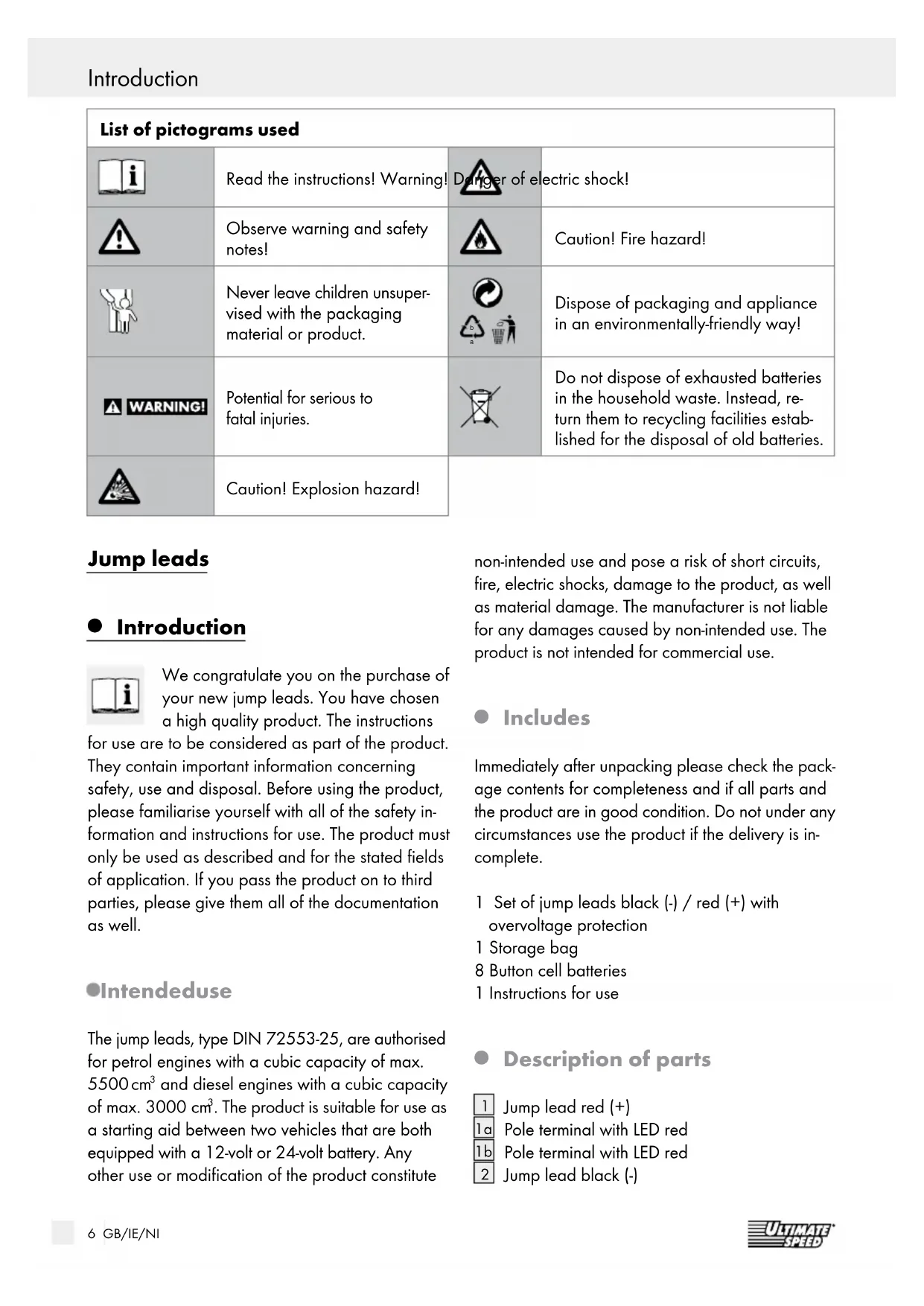 THE REACH OF CHILDREN! Swallowing batteries can cause chemical burns, Introduction / Safety Information8 GB/IE/NI Using the LED light / Using the jump leadsSafety Information perforation of soft tissue, and death. Severe burns may occur within 2 hours of swallowing batteries. Seek immediate medical attention. DANGER TO LIFE! Keep batteries / rechargeable batteries out of reach of children. If accidentally swallowed seek immediate medical attention. DANGER OF EXPLOSION! Never recharge non-rechargeable batteries. Do not short-circuit batter- ies / rechargeable batteries and / or open them. Overheating, fire or bursting can be the result. Never throw batteries / rechargeable batteries into fire or water. Do not exert mechanical loads to batteries / rechargeable batteries. Risk of leakage of batteries / rechargeable batteries Avoid extreme environmental conditions and temperatures, which could affect batteries / rechargeable batteries, e.g. radiators / direct sunlight. Avoid contact with the skin, eyes and mucous membranes. In the event of contact with bat- tery acid, thoroughly flush the affected area with plenty of clean water and seek immediate medical attention. WEAR PROTECTIVE GLOVES! Leaked or damaged batteries / rechargeable batteries can cause burns on contact with the skin. Wear suitable protective gloves at all times if such an event occurs. In the event of a leakage of batteries / rechargeable batteries, immediately remove them from the product to prevent damage. Only use the same type of batteries / recharge- able batteries. Do not mix used and new batteries / rechargeable batteries. Remove batteries / rechargeable batteries if the product will not be used for a longer period. Risk of damage of the product Only use the specified type of battery / rechargeable battery! Insert batteries / rechargeable batteries accord- ing to polarity marks (+) and (-) on the battery / rechargeable battery and the product. Clean the contacts on the battery / rechargea- ble battery and in the battery compartment before inserting! Remove exhausted batteries / rechargeable batteries from the product immediately.