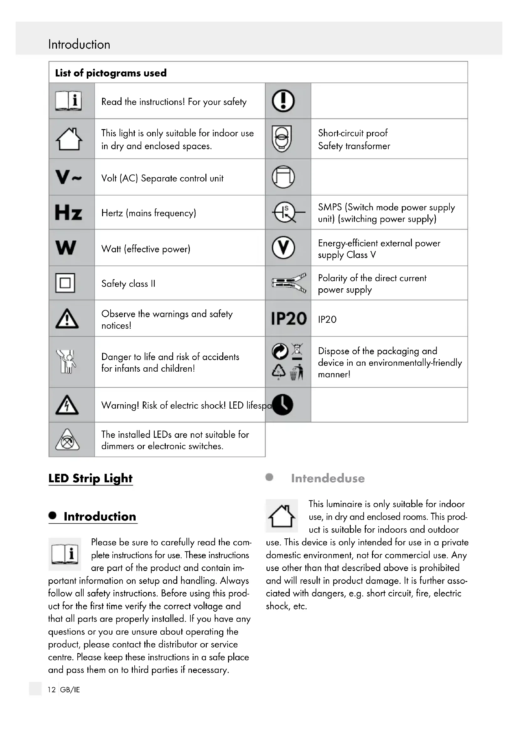 Dispose of the packaging and device in an environmentally-friendly manner! Warning! Risk of electric shock! LED lifespan The installed LEDs are not suitable for dimmers or electronic switches. LED Strip Light Introduction Please be sure to carefully read the com- plete instructions for use. These instructions are part of the product and contain im- portant information on setup and handling. Always follow all safety instructions. Before using this prod- uct for the first time verify the correct voltage and that all parts are properly installed. If you have any questions or you are unsure about operating the product, please contact the distributor or service centre. Please keep these instructions in a safe place and pass them on to third parties if necessary. Intended use This luminaire is only suitable for indoor use, in dry and enclosed rooms. This prod- uct is suitable for indoors and outdoor use. This device is only intended for use in a private domestic environment, not for commercial use. Any use other than that described above is prohibited and will result in product damage. It is further asso- ciated with dangers, e.g. short circuit, fire, electric shock, etc. Introduction Introduction / Safety13 GB/IE Scope of delivery Check immediately after unpacking that the parts are complete and that the product is in proper condition. 1 LED Strip Light 1 Cable holder 1 Adhesive strip 1 Set of instructions for use Parts Description