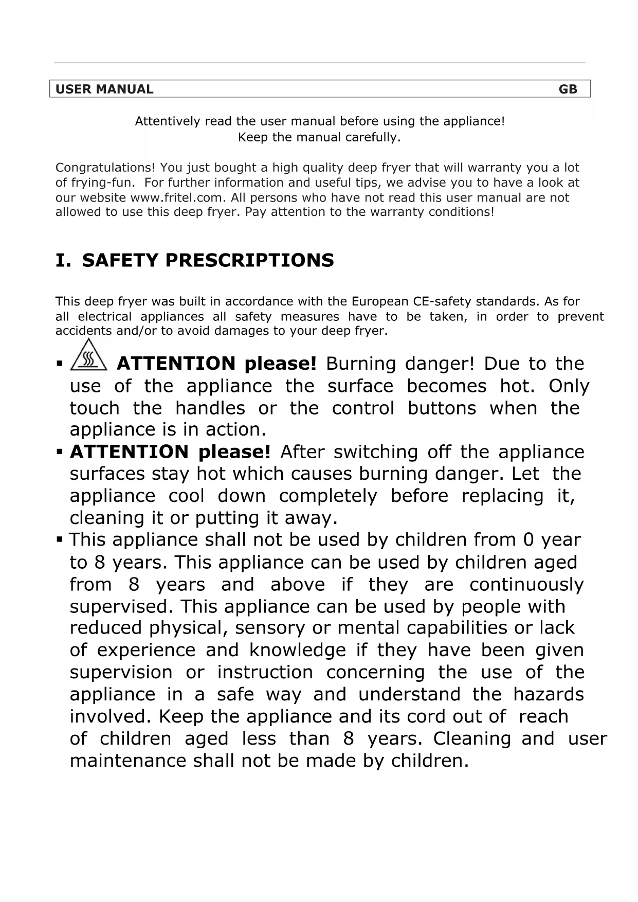 This deep fryer was built in accordance with the European CE-safety standards. As for all electrical appliances all safety measures have to be taken, in order to prevent accidents and/or to avoid damages to your deep fryer. ATTENTION please! Burning danger! Due to the use of the appliance the surface becomes hot. Only touch the handles or the control buttons when the appliance is in action. ATTENTION please! After switching off the appliance surfaces stay hot which causes burning danger. Let the appliance cool down completely before replacing it, cleaning it or putting it away. This appliance shall not be used by children from 0 year to 8 years. This appliance can be used by children aged from 8 years and above if they are continuously supervised. This appliance can be used by people with reduced physical, sensory or mental capabilities or lack of experience and knowledge if they have been given supervision or instruction concerning the use of the appliance in a safe way and understand the hazards involved. Keep the appliance and its cord out of reach of children aged less than 8 years. Cleaning and user maintenance shall not be made by children. Cooking appliances should be positioned in a stable situation with the handles (if any) positioned to avoid spillage of the hot liquids. This (these) fryer(s) is (are) not intended for domestic use. This appliance is intended to be used at roomtemperature. NEVER use the appliance outdoor. A damaged power cord can cause electric shocks. NEVER use the appliance if it is damaged, fallen or shows a malfunction, or if the power cord or plug are damaged. In all these cases return the appliance to your sales point or recognized after sales service. NEVER touch the heating element, the electrical cord or the plug with wet hands, and NEVER immerse them in water or any other liquid. They are only to be cleaned with a damp cloth. Should they get wet anyway, immediately pull out the plug from the socket. NEVER use separate timers or remote control systems. Immediately switch off the appliance and pull out the plug: after use or when the appliance is NOT in use, if the appliance does not function properly and when cleaning the appliance. Always remove all redundant icing-up in advance, again to avoid oil splashes. NEVER hang the basket, filled with frozen products above the oil. This causes dangerous splashes of the oil/frying fat. NEVER move the fryer as long as the oil or frying fat is hot. ALWAYS place the appliance on a solid and flat base, such as a kitchen counter or table, so that the appliance won’t move or turn over. NEVER pull the power cord tu unplug the appliance, but only the plug. NEVER use extension cords or sockets. Place the appliance near a power point and connect it directly. ALWAYS complete unroll the power cord. NEVER let the cord hang over the edge of the table or the counter. NEVER place the power supply cord near heat sources such as cookers, heatings or ovens. NEVER place the appliance near curtains, wall decoration, clothing, towels or other inflammable objects. Only use the deep fryer with 230 V AC. In accordance with the legal safety standards, the deep fryer must always be plugged into an earthed socket. For your own safety, the deep fryer will only work if it has been assembled correctly. Check that all parts were correctly assembled. Only use the deep fryer for frying food. NEVER leave the appliance unattended and NEVER move it when it is plugged in. The oil must be completely cooled off before folding in the handle or disassembling the deep fryer. NEVER turn the power cord around the deep fryer, NEVER bend it or squeeze it. ALWAYS switch off the appliance and pull out the plug: after use or when the appliance is not in use, if the appliance doesn’t work properly and when cleaning the appliance NEVER use accessories or spare parts from other appliances or brands. Repairs may only be done by a recognized repairer or service center.