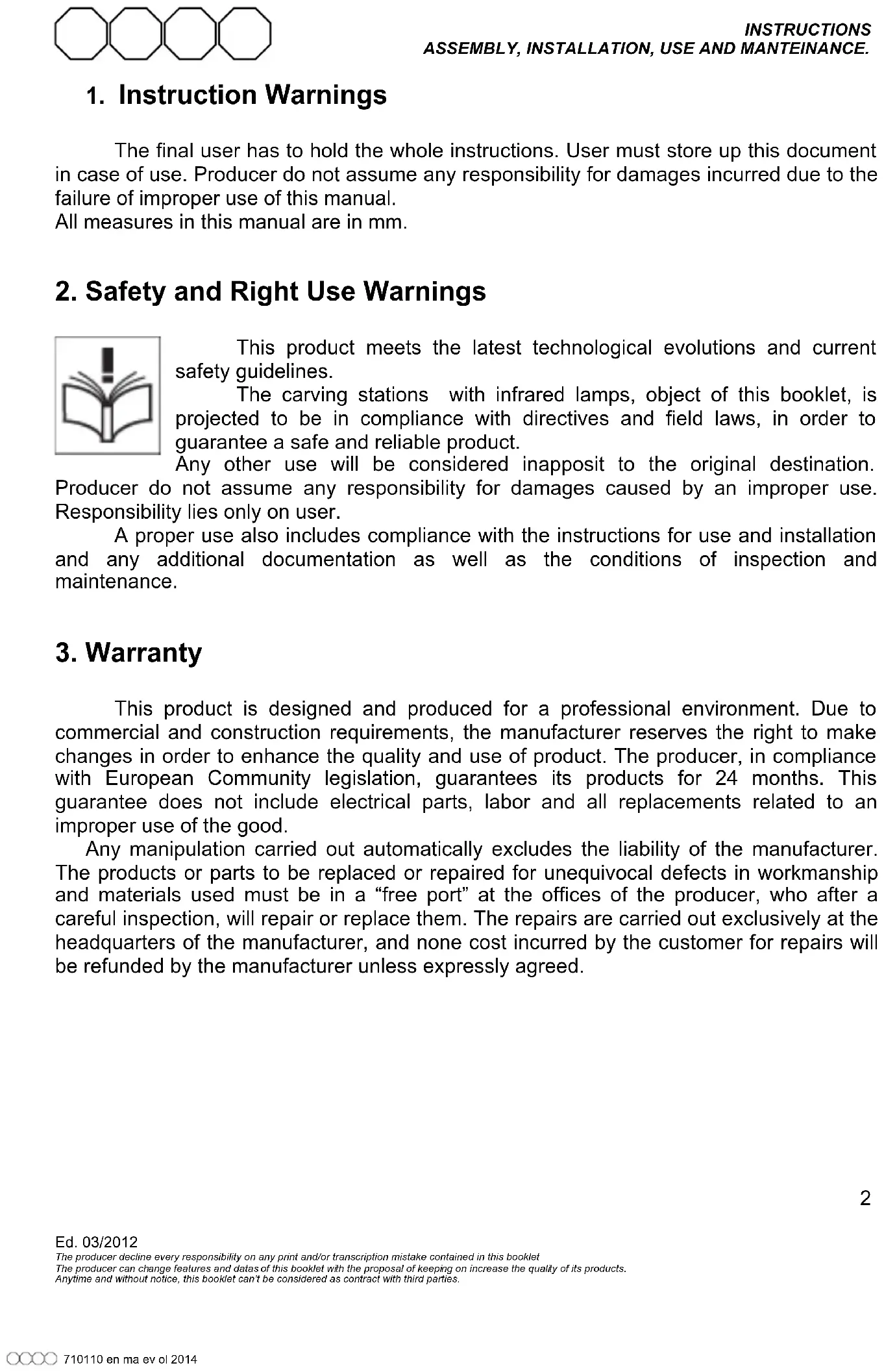 This product is designed and produced for a professional environment. Due to commercial and construction requirements, the manufacturer reserves the right to make changes in order to enhance the quality and use of product. The producer, in compliance with European Community legislation, guarantees its products for 24 months. This guarantee does not include electrical parts, labor and all replacements related to an improper use of the good. Any manipulation carried out automatically excludes the liability of the manufacturer. The products or parts to be replaced or repaired for unequivocal defects in workmanship and materials used must be in a “free port” at the offices of the producer, who after a careful inspection, will repair or replace them. The repairs are carried out exclusively at the headquarters of the manufacturer, and none cost incurred by the customer for repairs will be refunded by the manufacturer unless expressly agreed.710110 en ma ev ol 2014 INSTRUCTIONS ASSEMBLY, INSTALLATION, USE AND MANTEINANCE. Ed. 03/2012 The producer decline every responsibility on any print and/or transcription mistake contained in this booklet The producer can change features and datas of this booklet with the proposal of keeping on increase the quality of its products. Anytime and without notice, this booklet can’t be considered as contract with third parties.