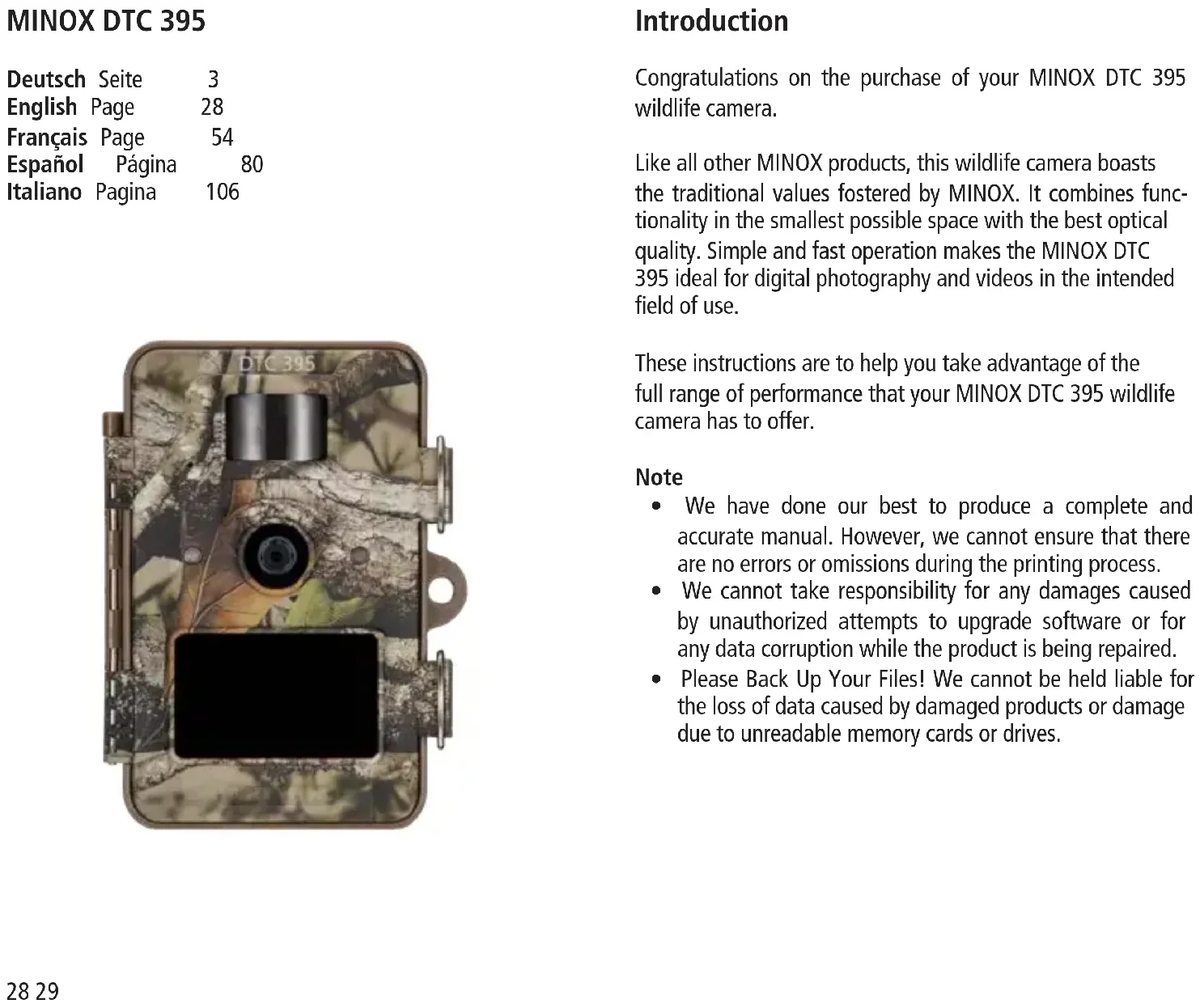 - Please Back Up Your Files! We cannot be held liable for the loss of data caused by damaged products or damage due to unreadable memory cards or drives. MINOX DTC 395 Deutsch Seite 3 English Page 28 Français Page 54 Español Página 80 Italiano Pagina 10630 31 Contents Introduction Page 29