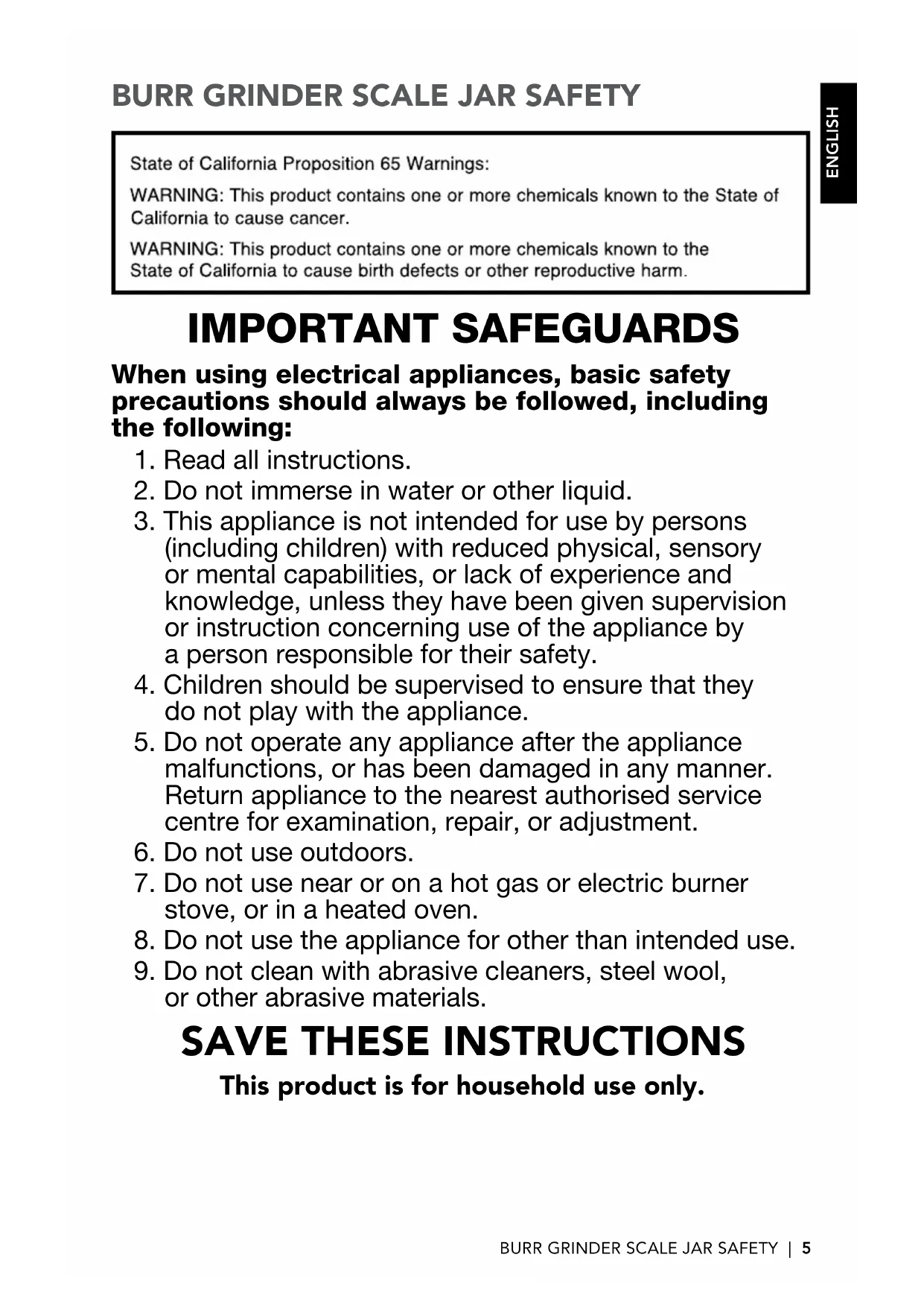 This product is for household use only.6 | BURR GRINDER SCALE JAR SAFETY ELECTRICAL REQUIREMENTS