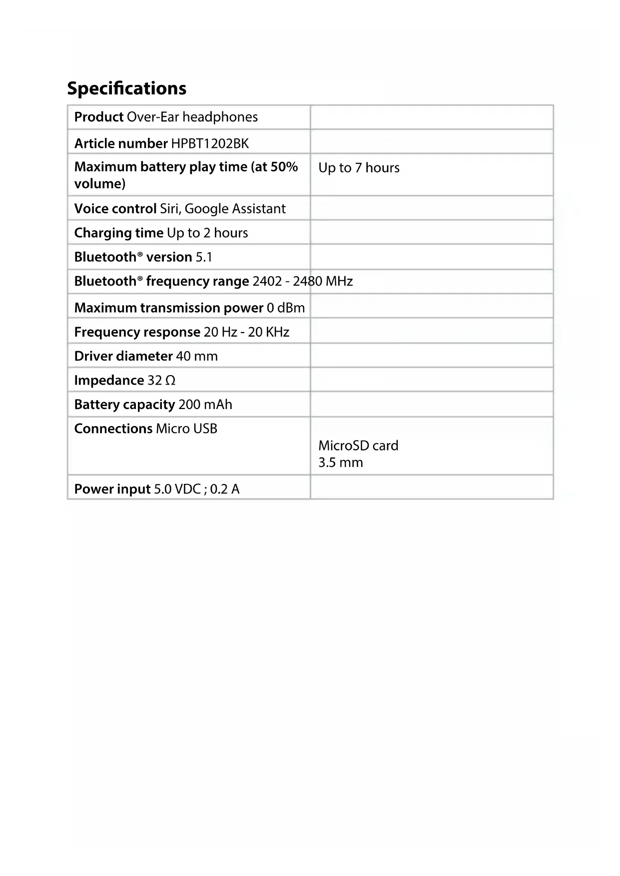 ASpecications Product Over-Ear headphones Article number HPBT1202BK Maximum battery play time (at 50% volume) Up to 7 hours Voice control Siri, Google Assistant Charging time Up to 2 hours Bluetooth® version 5.1 Bluetooth® frequency range 2402 - 2480 MHz Maximum transmission power 0 dBm Frequency response 20 Hz - 20 KHz Driver diameter 40 mm Impedance 32 Ω Battery capacity 200 mAh Connections Micro USB MicroSD card