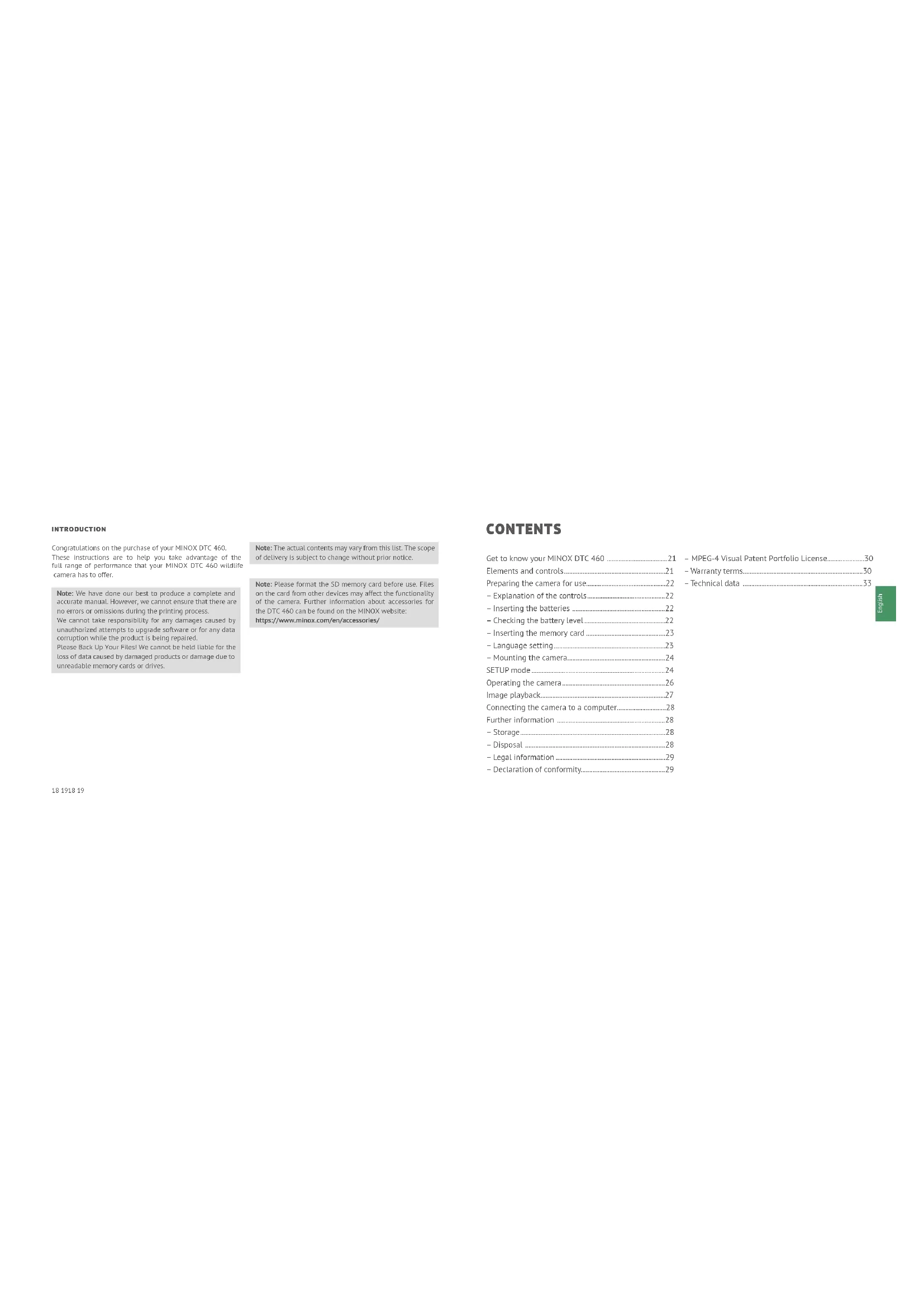 engaged in a personal and non-commercial activity and / or was obtained from a video provider licensed to provide MPEG-4 video. For other purposes, no license is granted or implied for the MPEG-4 standard. Further information can be obtained from MPEG LA, LLC on www.mpegla.com Warranty terms With the purchase of this MINOX DTC 460 you have acquired a product which has been manufactured and tested according to very high quality standards. The statutory warranty of 2 years provided for this product commences on the date of purcha- se from an authorized dealer and is subject to the following conditions: