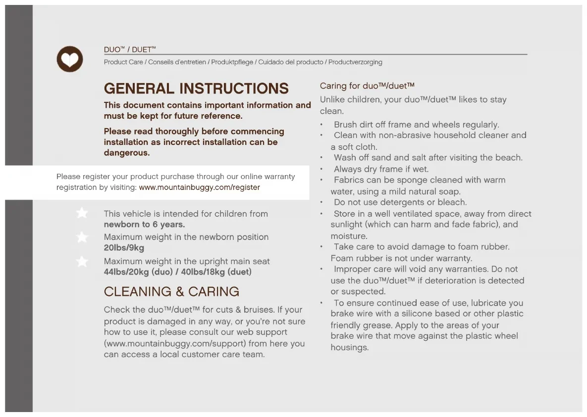 This document contains important information and must be kept for future reference. Please read thoroughly before commencing installation as incorrect installation can be dangerous. This vehicle is intended for children from newborn to 6 years. Maximum weight in the newborn position 20lbs/9kg Maximum weight in the upright main seat 44lbs/20kg (duo) / 40lbs/18kg (duet) GENERAL INSTRUCTIONS Caring for duo™/duet™ Unlike children, your duo™/duet™ likes to stay clean.