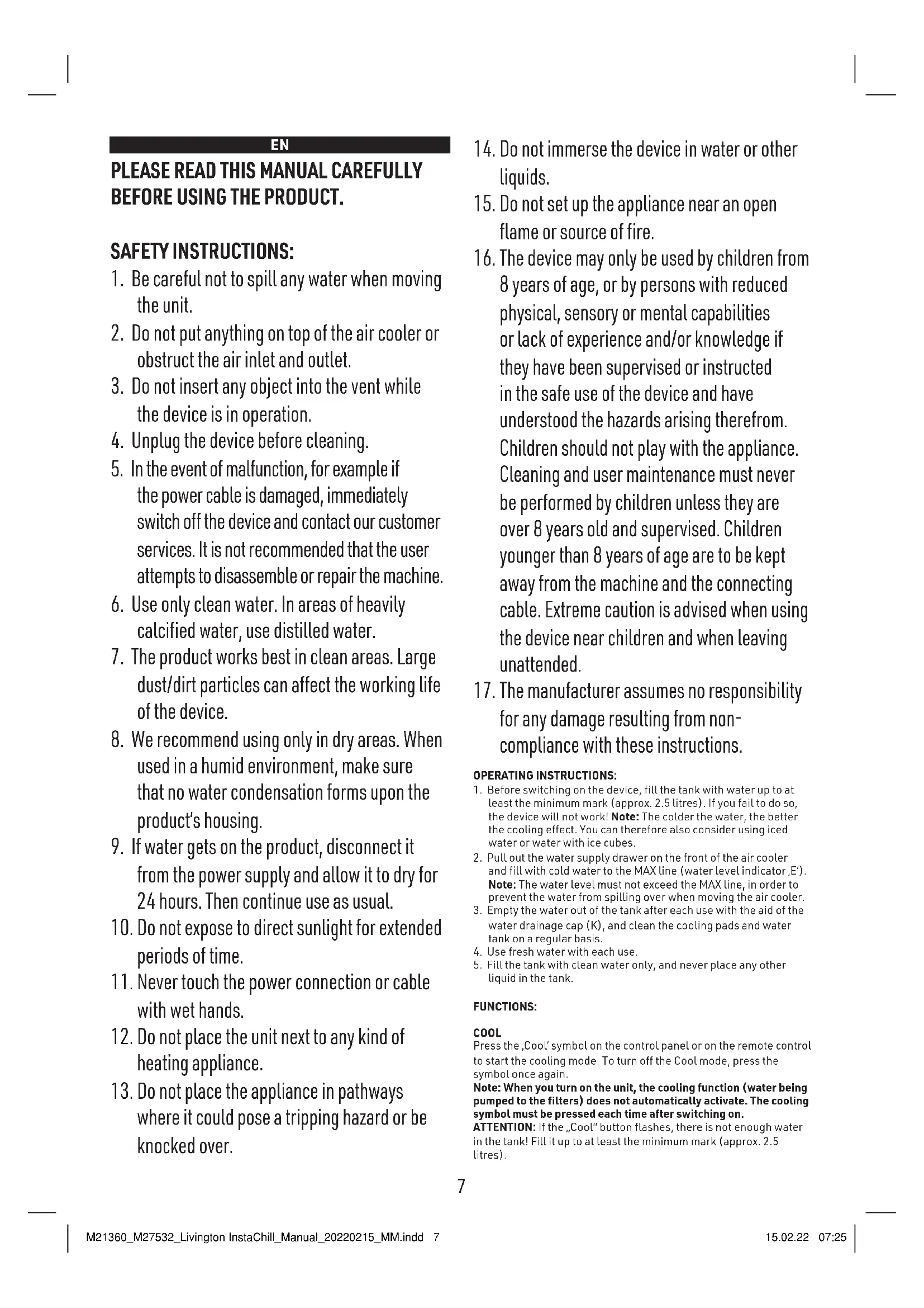 Troubleshooting: Problem Possible Cause Corrective Action Remarks The evaporative air cooler does not work and does not respond to the buttons being pressed. Power failure or faulty power connection. Measure the input voltage and connect the device to a dedicated power source. It is recommended to use a voltmeter to determine the precise voltage. The remote control batteries are empty. Change the batteries. The remote control or the control panel is damaged. Please contact our customer services. The remote control. The remote control must be pointed directly at the appliance. There is no air flow from the unit, even though the machine is in operation. The motor is damaged. Please contact our customer services. The thermal protection in the motor has been triggered. Turn off the appliance until the motor has cooled down. The pump works, but the appliance does not cool. The cooling function (water being pumped to the filters) is not switched on. The cooling symbol must be pressed again each time after switching on. The special filter is clogged or has become dirty. Clean or replace the special filter. The special filter is dry or does not contain enough water. Check the upper water distribution tray, and determine if there is a blockage. The cooling function is deactivated - please activate The relative humidity is excessively high. When the evaporative air cooler is used for an extended period of time, the humidity in the room can become very high, so the temperature can not be reduced to as great an extent. Turn the cooling mode to a lower level or deactivate it until the humidity has decreased. There is not enough water in the tank. Fill the tank up to at least the minimum mark (approx. 2.5 litres). Note: The colder the water, the better the cooling effect. "Cool" button flashes There is not enough water in the tank. Fill the tank up to at least the minimum mark (approx. 2.5 litres). Note: The colder the water, the better the cooling effect. The pump works, but does not circulate water, or the special filters contain too little water. The upper water distribution tray has become clogged. Clean the upper water distribution tray. There is not enough water in the tank. Fill the tank up to at least the minimum mark (approx. 2.5 litres). Note: The colder the water, the better the cooling effect. Water spurts out of the device. The special filter or the rear cover (J) is not in the right position. Position the special filter or the rear cover (J) correctly. The upper water distribution tray has become clogged. Clean the upper water distribution tray. There is an unpleasant odour. The water tank or the special filter is dirty. Clean the water tank and the special filter. White sediments are visible in the water tank. The water is too hard. Drain the water tank, and clean or de-scale the special filters and tank more frequently. In areas with hard water, use distilled water in the future. M21360_M27532_Livington InstaChill_Manual_20220215_MM.indd 9M21360_M27532_Livington InstaChill_Manual_20220215_MM.indd 9 15.02.22 07:2515.02.22 07:2510