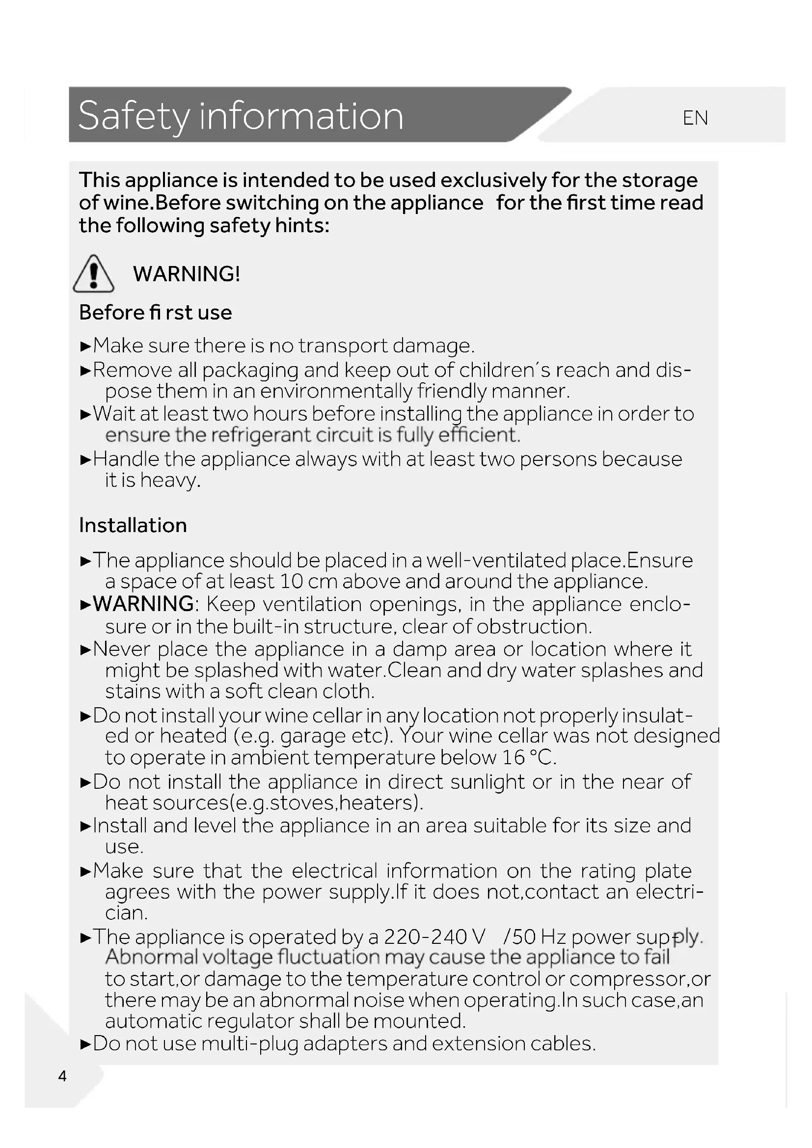 Ýëìöäóóïìäñæèìöìñ÷èñçèç÷òåèøöèçèûæïøöìùèïüéòõ÷ëèö÷òõäêè òéúìñèËèéòõèöúì÷æëìñêòñ÷ëèäóóïìäñæè éòõ÷ëèĨõö÷÷ìðèõèäç ÷ëèéòïïòúìñêöäéè÷üëìñ÷ö àÊÛ×Ò×Ð ËèéòõèĨõö÷øöè ▶ Make sure there is no transport damage. ▶ Remove all packaging and keep out of children´s reach and dis- pose them in an environmentally friendly manner. ▶ Wait at least two hours before installing the appliance in order to ▶ Handle the appliance always with at least two persons because it is heavy. Òñö÷äïïä÷ìòñ ▶ The appliance should be placed in a well-ventilated place.Ensure a space of at least 10 cm above and around the appliance. ▶ àÊÛ×Ò×Ð: Keep ventilation openings, in the appliance enclo- sure or in the built-in structure, clear of obstruction. ▶ Never place the appliance in a damp area or location where it might be splashed with water.Clean and dry water splashes and stains with a soft clean cloth. ▶ Do not install your wine cellar in any location not properly insulat- ed or heated (e.g. garage etc). Your wine cellar was not designed to operate in ambient temperature below 16 °C. ▶ Do not install the appliance in direct sunlight or in the near of heat sources(e.g.stoves,heaters). ▶ Install and level the appliance in an area suitable for its size and use. ▶ Make sure that the electrical information on the rating plate agrees with the power supply.If it does not,contact an electri- cian. ▶ The appliance is operated by a 220-240 V /50 Hz power sup- to start,or damage to the temperature control or compressor,or there may be an abnormal noise when operating.In such case,an automatic regulator shall be mounted. ▶ Do not use multi-plug adapters and extension cables. $EN Safety information WARNING! ▶ WARNING: Do not locate multiple portable socket outlets or portable power supplies at the rear of the appliance. ▶ WARNING: When positioning the appliance, ensure the supply cord is not trapped or damaged. ▶ Do not step on the power cable. ▶ Use a separate earthed socket for the power supply which is easy accessible. The appliance must be earthed. ▶ Only for UK: appliance is installed, the plug should be accesible. ▶ WARNING: Do not damage the refrigerant circuit. Daily use ▶ This appliance can be used by children aged from 8 years and above and persons with reduced physical, sensory or mental capabilities or lack of experience and knowledge if they have been given supervision or instruction concerning use of the ap- pliance in a safe way and understand the hazards involved. ▶ Children shall not play with the appliance. ▶ Children aged from 3 to 8 years are allowed to load and unload refrigerating appliances, but not allowed to clean and install the refrigerating appliances. ▶ Keep away children under 3 years of age from the appliance un- less they are constantly supervised. ▶ Cleaning and user maintenance shall not be made by children with out supervision. ▶ The appliance must be positioned so that the plug is accessible. ▶ If coal gas or other in ammable gas is leaking into vicinity of the appliance,turn o the valve of the leaking gas, open the doors and windows and do not unplug the power cable of the appliance . ▶ Wait at least 7 minutes to reconnect the power after the power has been disconnected. ▶ Do not lift the appliance by its door handles. 5EN àÊÛ×Ò×Ð