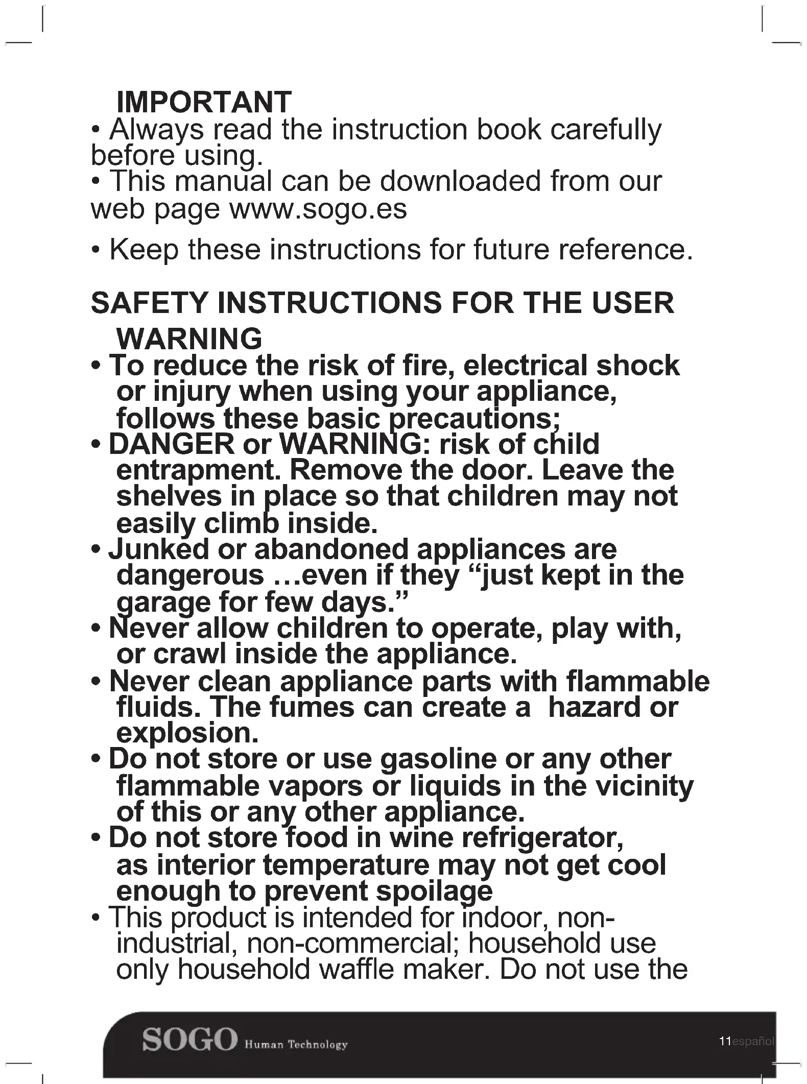 - This product is intended for indoor, non- industrial, non-commercial; household use only household wae maker. Do not use the12 español english français portuguese deutsch italiano item outdoors or for any other purpose. Misuse or improper handling may cause problems in the appliance and cause injury to the user.