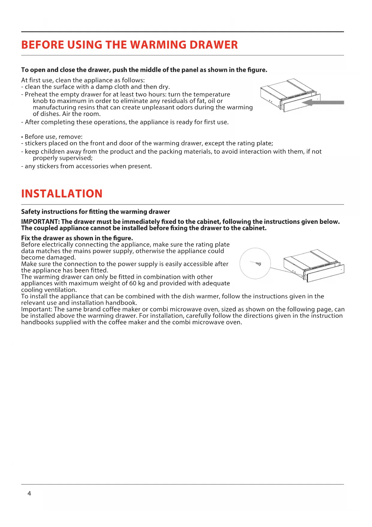 - Before use, remove: - stickers placed on the front and door of the warming drawer, except the rating plate; - keep children away from the product and the packing materials, to avoid interaction with them, if not properly supervised; - any stickers from accessories when present. INSTALLATION Safety instructions for tting the warming drawer IMPORTANT: The drawer must be immediately xed to the cabinet, following the instructions given below. The coupled appliance cannot be installed before xing the drawer to the cabinet. Fix the drawer as shown in the gure. Before electrically connecting the appliance, make sure the rating plate data matches the mains power supply, otherwise the appliance could become damaged. Make sure the connection to the power supply is easily accessible after the appliance has been fitted. The warming drawer can only be fitted in combination with other appliances with maximum weight of 60 kg and provided with adequate cooling ventilation. To install the appliance that can be combined with the dish warmer, follow the instructions given in the relevant use and installation handbook. Important: The same brand coffee maker or combi microwave oven, sized as shown on the following page, can be installed above the warming drawer. For installation, carefully follow the directions given in the instruction handbooks supplied with the coffee maker and the combi microwave oven.EN