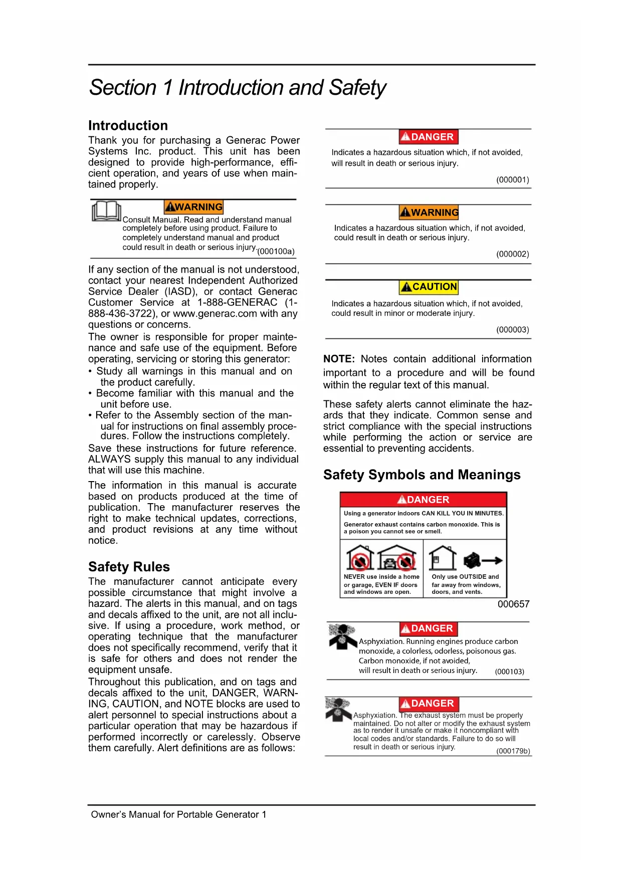(000103) DANGER Asphyxiation. Running engines produce carbon monoxide, a colorless, odorless, poisonous gas. Carbon monoxide, if not avoided, will result in death or serious injury. (000179b) DANGER Asphyxiation. The exhaust system must be properly maintained. Do not alter or modify the exhaust system as to render it unsafe or make it noncompliant with local codes and/or standards. Failure to do so will result in death or serious injury.2 Owner’s Manual for Portable Generator