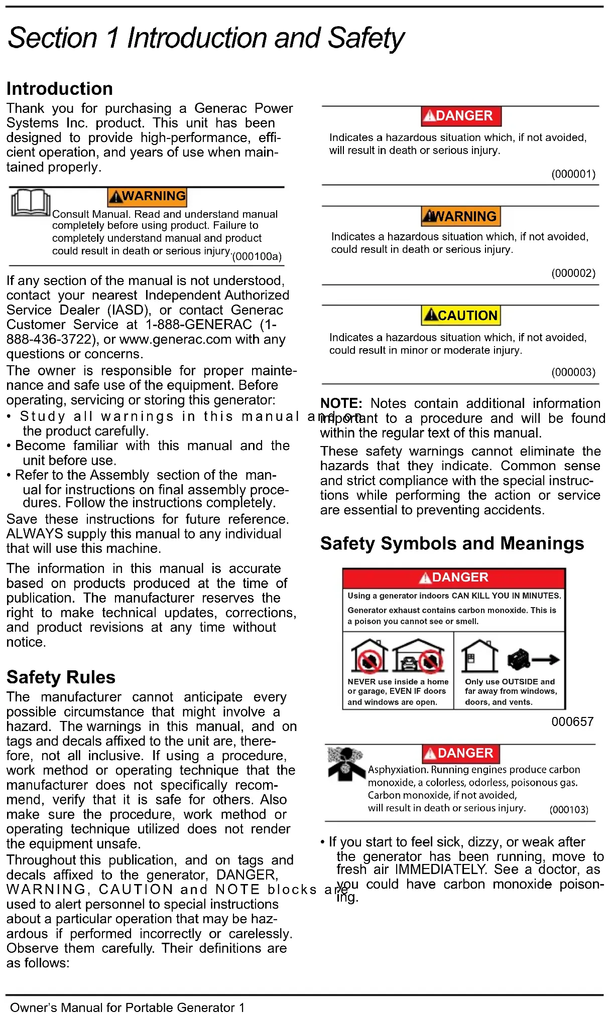 - If you start to feel sick, dizzy, or weak after the generator has been running, move to fresh air IMMEDIATELY. See a doctor, as you could have carbon monoxide poison- ing. (000100a) WARNING Consult Manual. Read and understand manualcompletely before using product. Failure to completely understand manual and productcould result in death or serious injury. (000001) DANGER Indicates a hazardous situation which, if not avoided, will result in death or serious injury. (000002) WARNING Indicates a hazardous situation which, if not avoided,could result in death or serious injury. (000003) CAUTION Indicates a hazardous situation which, if not avoided,could result in minor or moderate injury. DANGERUsing a generator indoors CAN KILL YOU IN MINUTES. Generator exhaust contains carbon monoxide. This is a poison you cannot see or smell.NEVER use inside a home or garage, EVEN IF doors and windows are open.Only use OUTSIDE and far away from windows, doors, and vents.