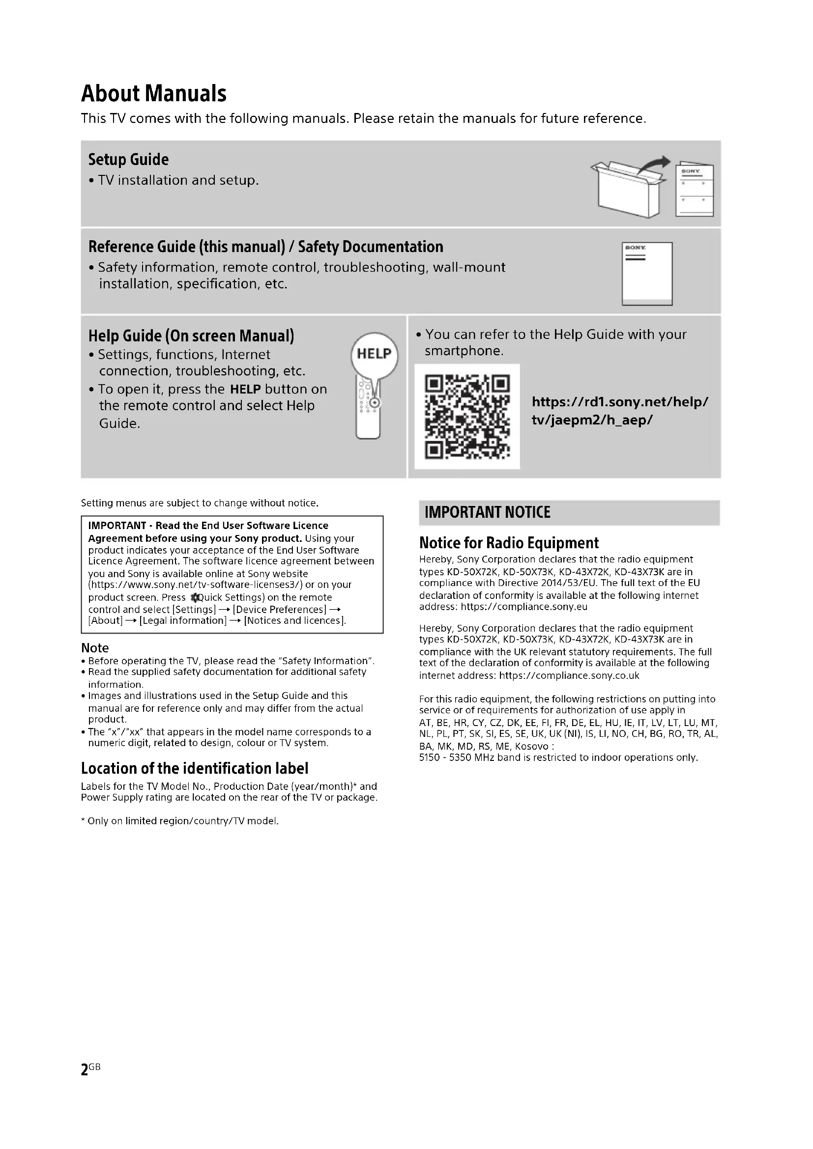 - Only on limited region/country/TV model. Notice for Radio Equipment Hereby, Sony Corporation declares that the radio equipment types KD-50X72K, KD-50X73K, KD-43X72K, KD-43X73K are in compliance with Directive 2014/53/EU. The full text of the EU declaration of conformity is available at the following internet address: https://compliance.sony.eu Hereby, Sony Corporation declares that the radio equipment types KD-50X72K, KD-50X73K, KD-43X72K, KD-43X73K are in compliance with the UK relevant statutory requirements. The full text of the declaration of conformity is available at the following internet address: https://compliance.sony.co.uk For this radio equipment, the following restrictions on putting into service or of requirements for authorization of use apply in AT, BE, HR, CY, CZ, DK, EE, FI, FR, DE, EL, HU, IE, IT, LV, LT, LU, MT, NL, PL, PT, SK, SI, ES, SE, UK, UK (NI), IS, LI, NO, CH, BG, RO, TR, AL, BA, MK, MD, RS, ME, Kosovo : 5150 - 5350 MHz band is restricted to indoor operations only. Setup Guide