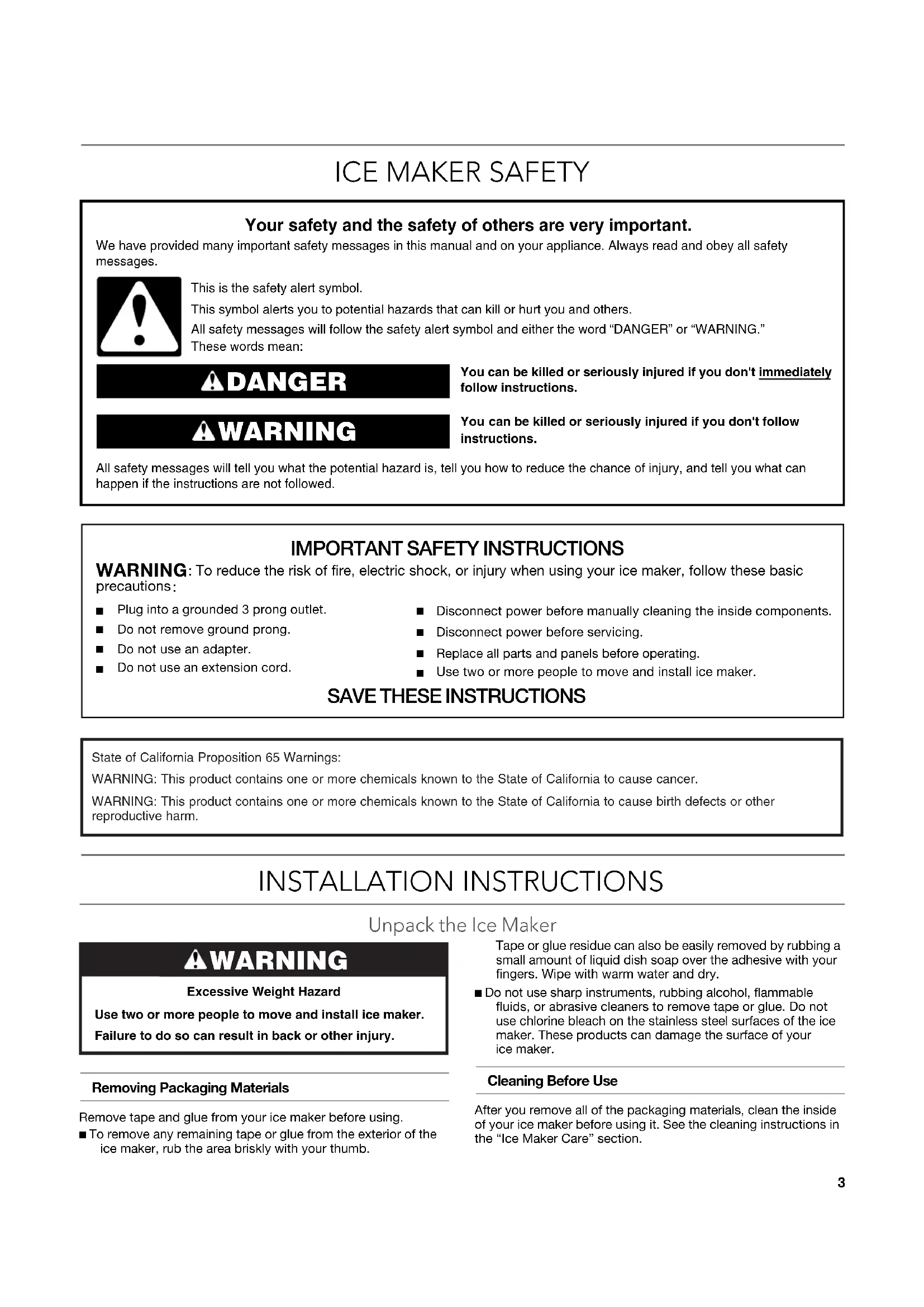 INSTALLATION INSTRUCTIONS Unpack the Ice Maker Removing Packaging MaterialsRemove tape and glue from your ice maker before using.■ To remove any remaining tape or glue from the exterior of the ice maker, rub the area briskly with your thumb. Tape or glue residue can also be easily removed by rubbing a small amount of liquid dish soap over the adhesive with your fingers. Wipe with warm water and dry.■ Do not use sharp instruments, rubbing alcohol, flammable fluids, or abrasive cleaners to remove tape or glue. Do not use chlorine bleach on the stainless steel surfaces of the ice maker. These products can damage the surface of your ice maker. Cleaning Before UseAfter you remove all of the packaging materials, clean the inside of your ice maker before using it. See the cleaning instructions in the “Ice Maker Care” section. You can be killed or seriously injured if you don't immediately You can be killed or seriously injured if you don'tfollow All safety messages will tell you what the potential hazard is, tell you how to reduce the chance of injury, and tell you what can happen if the instructions are not followed. Your safety and the safety of others are very important. We have provided many important safety messages in this manual and on your appliance. Always read and obey all safety messages.This is the safety alert symbol.This symbol alerts you to potential hazards that can kill or hurt you and others.All safety messages will follow the safety alert symbol and either the word “DANGER” or “WARNING.”These words mean:follow instructions.instructions. DANGER WARNING