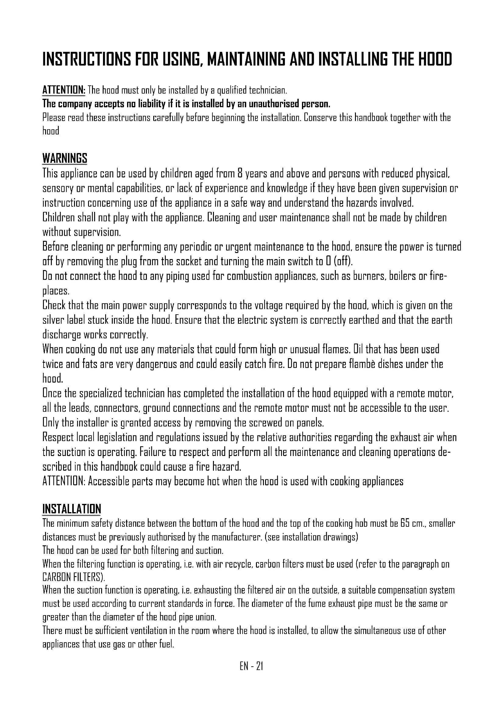 Prima di effettuare qualsiasi intervento di pulizia e manutenzione, togliere l'alimentazione alla cappa portan- do l'interruttore generale in posizione 0 (OFF). Sostituzione lampade Alogena 12V attacco G4: Togliere mediante cacciavite, l'anello di supporto vetro (Fig. 5). Togliere il vetro e sostituire la lampada con una identica. Rimontare il vetro di protezione e fissarlo reinserendo l'apposito anello. Le lampade posso- no essere acquistate presso qualsiasi negozio di materiale elettrico. Lampada dicroica attacco GU4: Togliere mediante cacciavite e sostituire la lampada con una identica (Fig. 6). Faretto led: La sostituzione del faretto led deve essere fatta solo da tecnici qualificati utilizzando solo ricambi origi- nali. Pulizia dei filtri metallici I filtri metallici in dotazione alla cappa vanno lavati ogni 2-3 mesi in funzione dell'intensità d'uso, con acqua calda e detersivo liquido non aggressivo. I filtri metallici vanno tolti utilizzando l'apposita maniglia sganciando il filtro prima nella parte anteriore tirandolo verso il basso (fig. 7). Dopo il lavaggio i filtri devono essere completamente asciugati e rimontati correttamente. Filtri carbone Se la cappa è utilizzata con sistema filtrante con riciclo interno, è necessario l'impiego di filtri carbone che sono dei contenitori di carbone attivo. Il carbone attivo contenuto nei filtri, serve a trattenere gli odori dei fumi di cucina. Per la rimozione e sostituzione dei filtri fare riferimento alla fig. 8. I filtri carbone POLIESTERE non possono essere rigenerati o lavati e vanno sostituiti periodicamente (ogni 4 mesi se si utilizza la cappa per due ore al giorno). I filtri saturi di grassi infatti possono essere causa di incendi. In base al modello di cappa, i filtri carbone possono essere di forma circolare oppure rettangolare. I filtri carbone LONG LIFE devono essere lavati e rigenerati periodicamente. Il filtro deve essere pulito ogni due mesi se usato normalmente. E’ preferibile lavare il filtro in lavastoviglie alla massima temperatura con detersivo normale. Il filtro deve essere lavato da solo per evitare che le particelle di cibo entrino in esso causando successivamente un odore sgradevole. Per riattivare il carbone attivo, il filtro deve essere asciugato in forno. Selezionare il riscaldamen- to superiore / inferiore a massimo 100 ° C ed asciugare il filtro per 10 minuti. Il filtro deve essere sostituito quando non è più in grado di assorbire in modo soddisfacente gli odori di cottura. Fig.9 Pulizia della cappa La pulizia periodica delle superfici evita di dover successivamente rimuovere con difficoltà depositi di sporco incro- stato. Se la cappa è verniciata o ramata, usare un panno morbido con acqua tiepida e detersivo neutro. E' vietato versare liquidi direttamente sulla cappa e l'uso di prodotti granulosi e/o abrasivi. Se la cappa è in acciaio inox, usare prodotti e panni specifici per acciaio inox satinato (non abrasivi e/o corrosivi e privi di cloro), avendo cura di seguire col panno il verso della satinatura. Non usare prodotti aggressivi, solventi chimici o derivati da distillati di petrolio che potrebbero lasciare residui oleosi suscettibili d'ossidazione e polimerizzazione. Murano-Manta-Merak-Dubhe: quando si usa olio per cucinare, dell’olio potrebbe scendere sulla parte bassa della cappa. Questa parte dovrebbe essere pulita spesso La ditta costruttrice non risponde di danni estetici causati da inosservanza delle indicazioni so- praelencate.EN - 21 INSTRUCTIONS FOR USING, MAINTAINING AND INSTALLING THE HOOD ATTENTION: The hood must only be installed by a qualified technician. The company accepts no liability if it is installed by an unauthorised person. Please read these instructions carefully before beginning the installation. Conserve this handbook together with the hood WARNINGS This appliance can be used by children aged from 8 years and above and persons with reduced physical, sensory or mental capabilities, or lack of experience and knowledge if they have been given supervision or instruction concerning use of the appliance in a safe way and understand the hazards involved. Children shall not play with the appliance. Cleaning and user maintenance shall not be made by children without supervision. Before cleaning or performing any periodic or urgent maintenance to the hood, ensure the power is turned off by removing the plug from the socket and turning the main switch to 0 (off). Do not connect the hood to any piping used for combustion appliances, such as burners, boilers or fire- places. Check that the main power supply corresponds to the voltage required by the hood, which is given on the silver label stuck inside the hood. Ensure that the electric system is correctly earthed and that the earth discharge works correctly. When cooking do not use any materials that could form high or unusual flames. Oil that has been used twice and fats are very dangerous and could easily catch fire. Do not prepare flambè dishes under the hood. Once the specialized technician has completed the installation of the hood equipped with a remote motor, all the leads, connectors, ground connections and the remote motor must not be accessible to the user. Only the installer is granted access by removing the screwed on panels. Respect local legislation and regulations issued by the relative authorities regarding the exhaust air when the suction is operating. Failure to respect and perform all the maintenance and cleaning operations de- scribed in this handbook could cause a fire hazard. ATTENTION: Accessible parts may become hot when the hood is used with cooking appliances INSTALLATION The minimum safety distance between the bottom of the hood and the top of the cooking hob must be 65 cm., smaller distances must be previously authorised by the manufacturer. (see installation drawings) The hood can be used for both filtering and suction. When the filtering function is operating, i.e. with air recycle, carbon filters m
