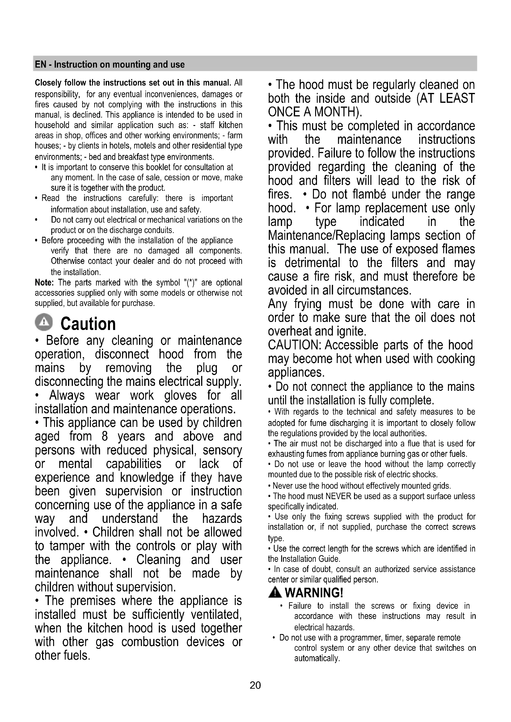 - This must be completed in accordance with the maintenance instructions provided. Failure to follow the instructions provided regarding the cleaning of the hood and filters will lead to the risk of fires. • Do not flambé under the range hood. • For lamp replacement use only lamp type indicated in the Maintenance/Replacing lamps section of this manual. The use of exposed flames is detrimental to the filters and may cause a fire risk, and must therefore be avoided in all circumstances. Any frying must be done with care in order to make sure that the oil does not overheat and ignite. CAUTION: Accessible parts of the hood may become hot when used with cooking appliances.
