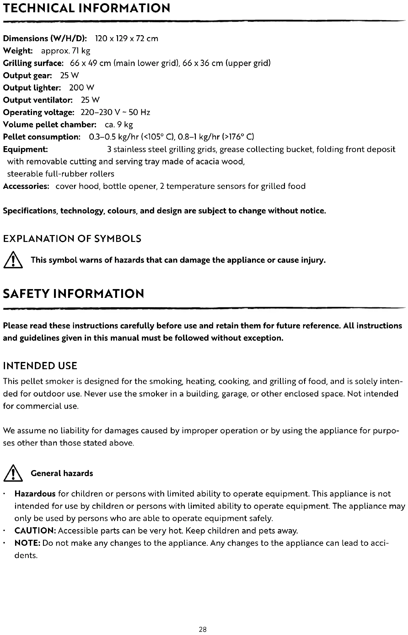This symbol warns of hazards that can damage the appliance or cause injury. SAFETY INFORMATION Please read these instructions carefully before use and retain them for future reference. All instructions and guidelines given in this manual must be followed without exception. INTENDED USE This pellet smoker is designed for the smoking, heating, cooking, and grilling of food, and is solely inten- ded for outdoor use. Never use the smoker in a building, garage, or other enclosed space. Not intended for commercial use. We assume no liability for damages caused by improper operation or by using the appliance for purpo- ses other than those stated above.