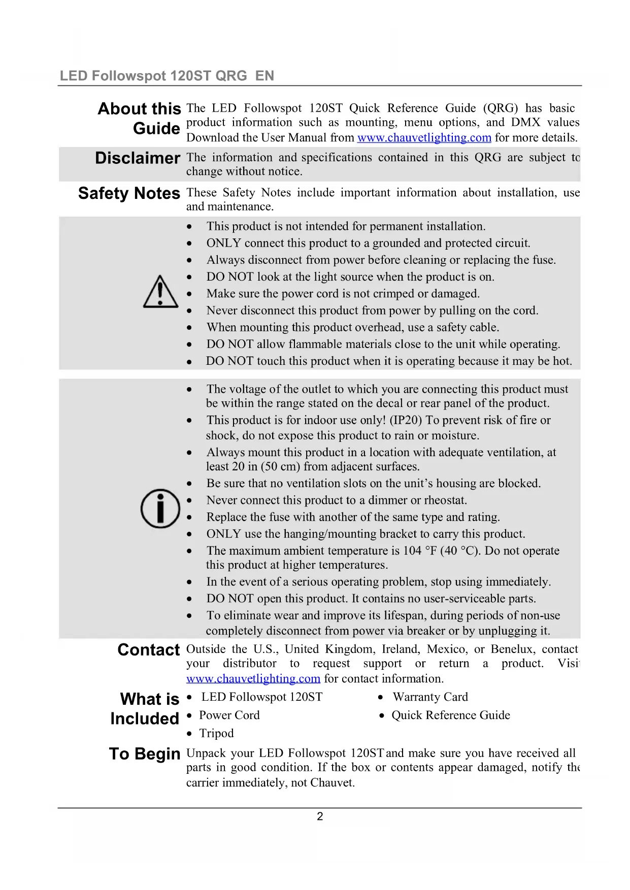 - Quick Reference Guide To Begin Unpack your LED Followspot 120ST and make sure you have received all parts in good condition. If the box or contents appear damaged, notify the carrier immediately, not Chauvet.LED Followspot 120ST QRG EN