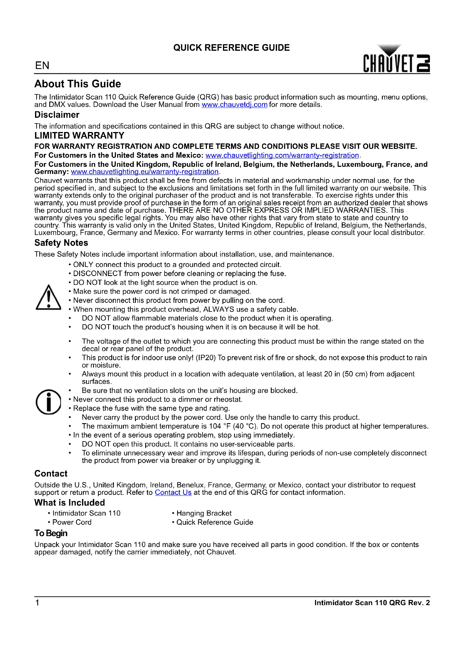 Chauvet warrants that this product shall be free from defects in material and workmanship under normal use, for the period specified in, and subject to the exclusions and limitations set forth in the full limited warranty on our website. This warranty extends only to the original purchaser of the product and is not transferable. To exercise rights under this warranty, you must provide proof of purchase in the form of an original sales receipt from an authorized dealer that shows the product name and date of purchase. THERE ARE NO OTHER EXPRESS OR IMPLIED WARRANTIES. This warranty gives you specific legal rights. You may also have other rights that vary from state to state and country to country. This warranty is valid only in the United States, United Kingdom, Republic of Ireland, Belgium, the Netherlands, Luxembourg, France, Germany and Mexico. For warranty terms in other countries, please consult your local distributor. Safety Notes These Safety Notes include important information about installation, use, and maintenance. Contact Outside the U.S., United Kingdom, Ireland, Benelux, France, Germany, or Mexico, contact your distributor to request support or return a product. Refer to Contact Us at the end of this QRG for contact information. What is Included To Begin Unpack your Intimidator Scan 110 and make sure you have received all parts in good condition. If the box or contents appear damaged, notify the carrier immediately, not Chauvet.