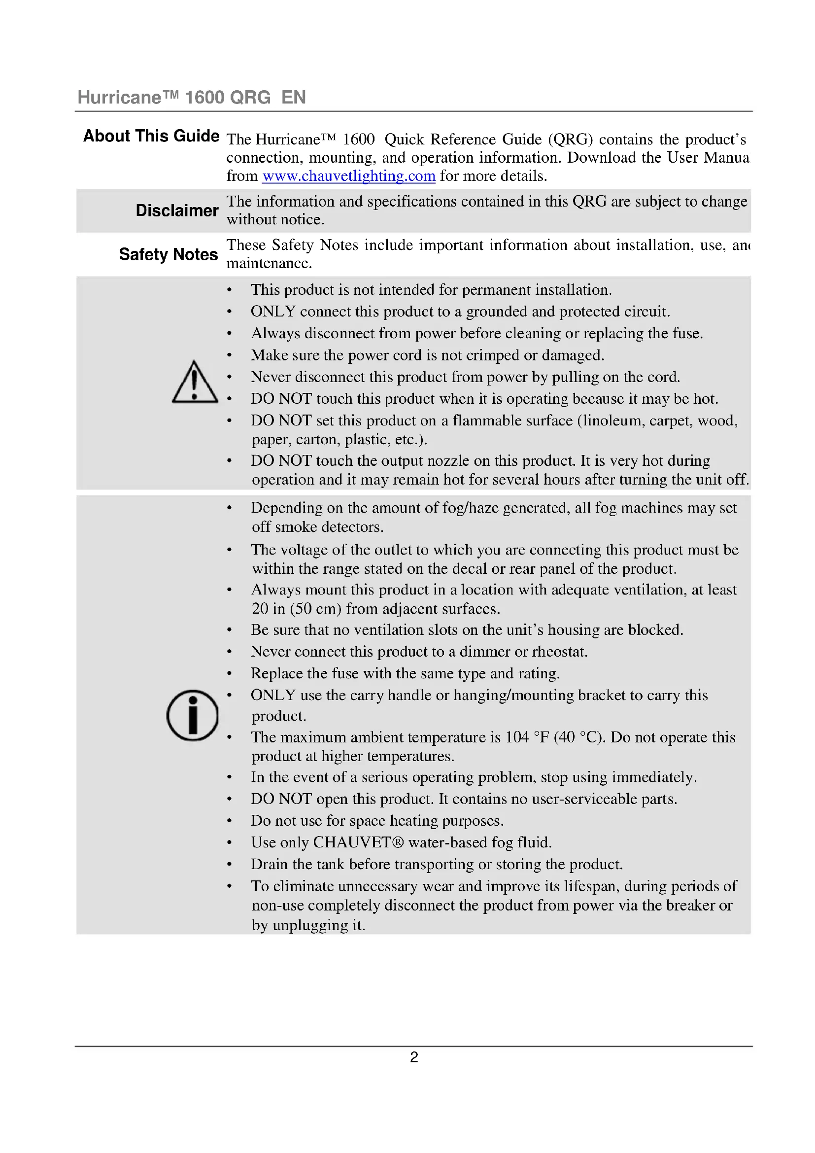 About This Guide The Hurricane™ 1600 Quick Reference Guide (QRG) contains the product’s connection, mounting, and operation information. Download the User Manual from www.chauvetlighting.com for more details. Disclaimer