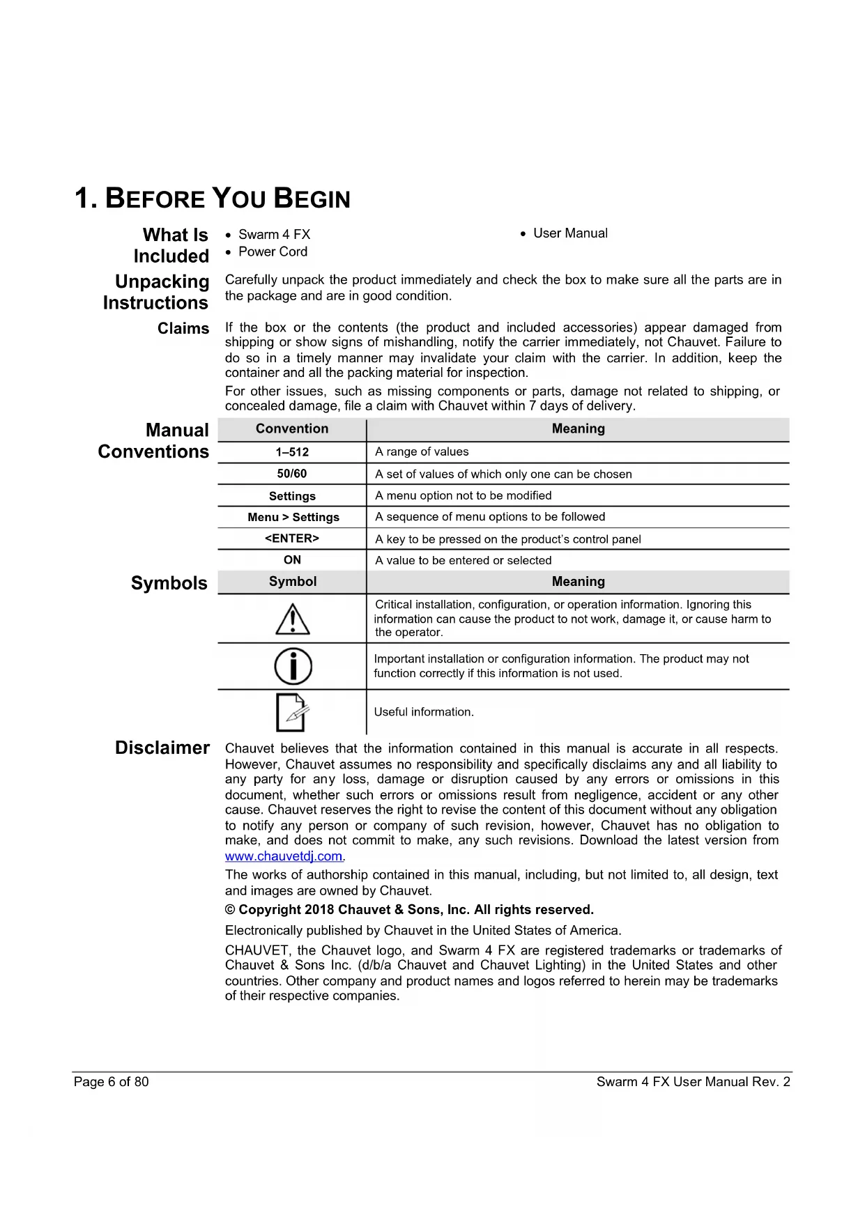 Carefully unpack the product immediately and check the box to make sure all the parts are in the package and are in good condition. Claims If the box or the contents (the product and included accessories) appear damaged from shipping or show signs of mishandling, notify the carrier immediately, not Chauvet. Failure to do so in a timely manner may invalidate your claim with the carrier. In addition, keep the container and all the packing material for inspection. For other issues, such as missing components or parts, damage not related to shipping, or concealed damage, file a claim with Chauvet within 7 days of delivery. Manual Conventions Convention Meaning 1–512 A range of values 50/60 A set of values of which only one can be chosen Settings A menu option not to be modified Menu > Settings A sequence of menu options to be followed <ENTER> A key to be pressed on the product’s control panel