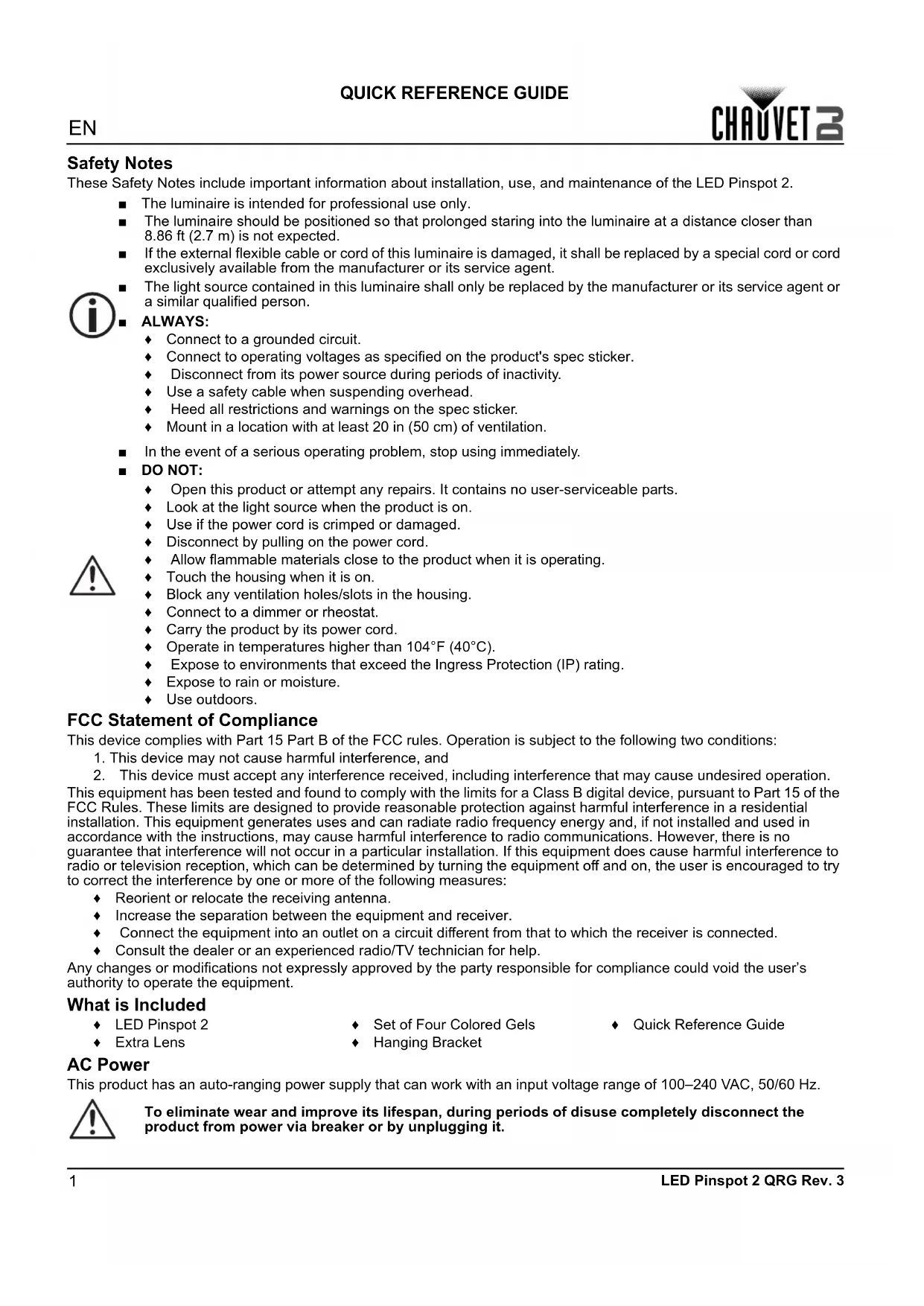 LED Pinspot 2 QRG Rev. 3 Safety Notes These Safety Notes include important information about installation, use, and maintenance of the LED Pinspot 2. FCC Statement of Compliance This device complies with Part 15 Part B of the FCC rules. Operation is subject to the following two conditions: