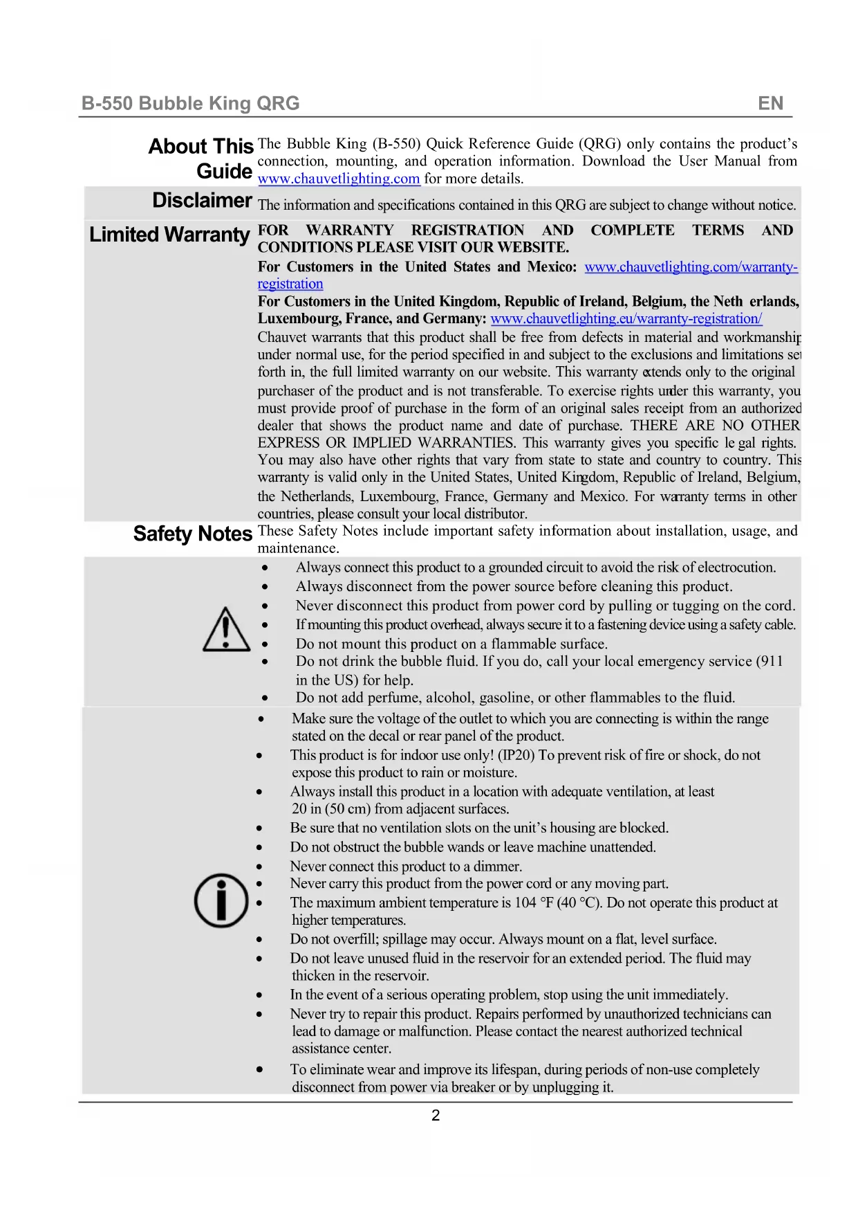 About This Guide The Bubble King (B-550) Quick Reference Guide (QRG) only contains the product’s connection, mounting, and operation information. Download the User Manual from www.chauvetlighting.com for more details. Disclaimer The information and specifications contained in this QRG are subject to change without notice.