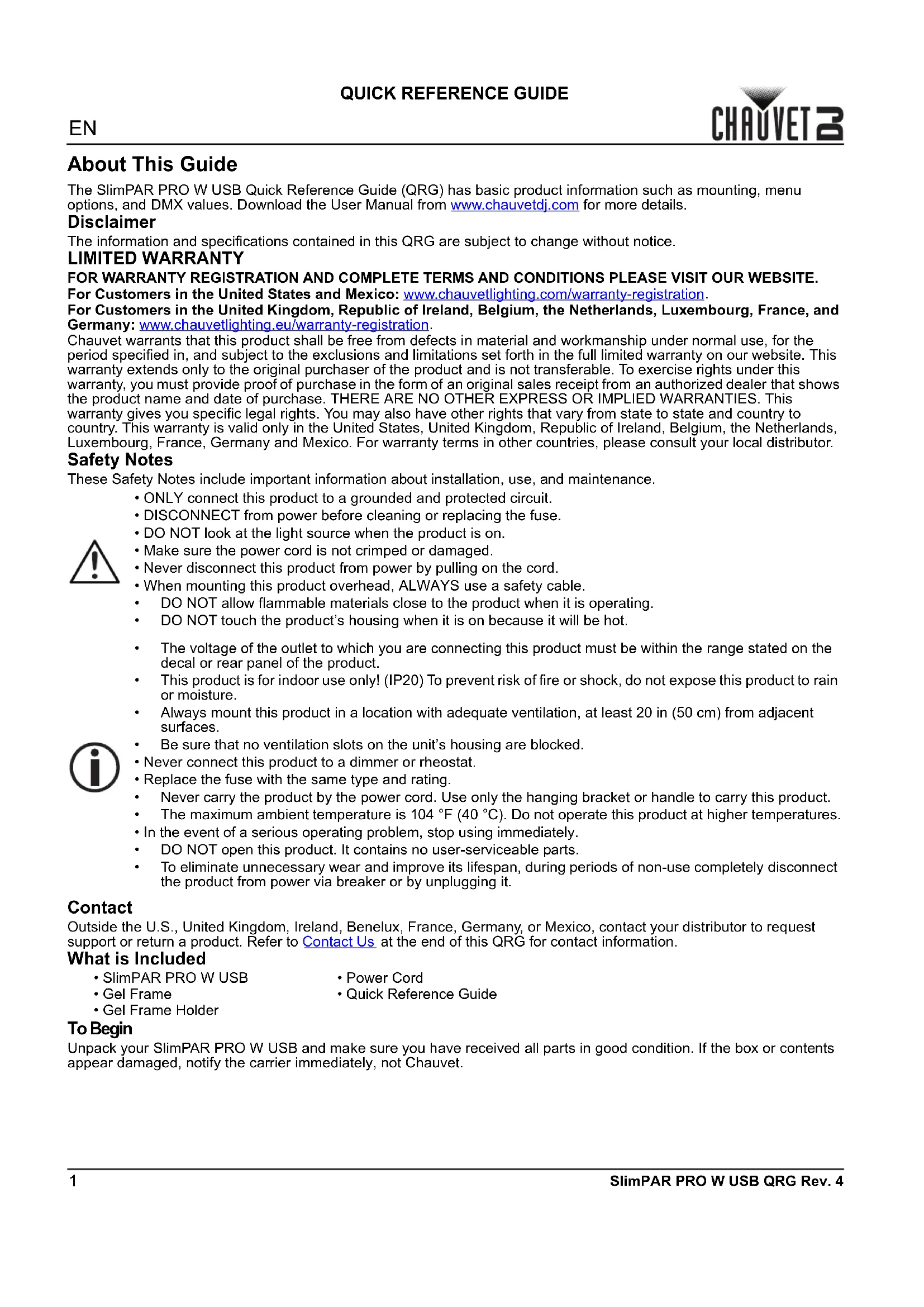 Chauvet warrants that this product shall be free from defects in material and workmanship under normal use, for the period specified in, and subject to the exclusions and limitations set forth in the full limited warranty on our website. This warranty extends only to the original purchaser of the product and is not transferable. To exercise rights under this warranty, you must provide proof of purchase in the form of an original sales receipt from an authorized dealer that shows the product name and date of purchase. THERE ARE NO OTHER EXPRESS OR IMPLIED WARRANTIES. This warranty gives you specific legal rights. You may also have other rights that vary from state to state and country to country. This warranty is valid only in the United States, United Kingdom, Republic of Ireland, Belgium, the Netherlands, Luxembourg, France, Germany and Mexico. For warranty terms in other countries, please consult your local distributor. Safety Notes These Safety Notes include important information about installation, use, and maintenance. Contact Outside the U.S., United Kingdom, Ireland, Benelux, France, Germany, or Mexico, contact your distributor to request support or return a product. Refer to Contact Us at the end of this QRG for contact information. What is Included To Begin Unpack your SlimPAR PRO W USB and make sure you have received all parts in good condition. If the box or contents appear damaged, notify the carrier immediately, not Chauvet.