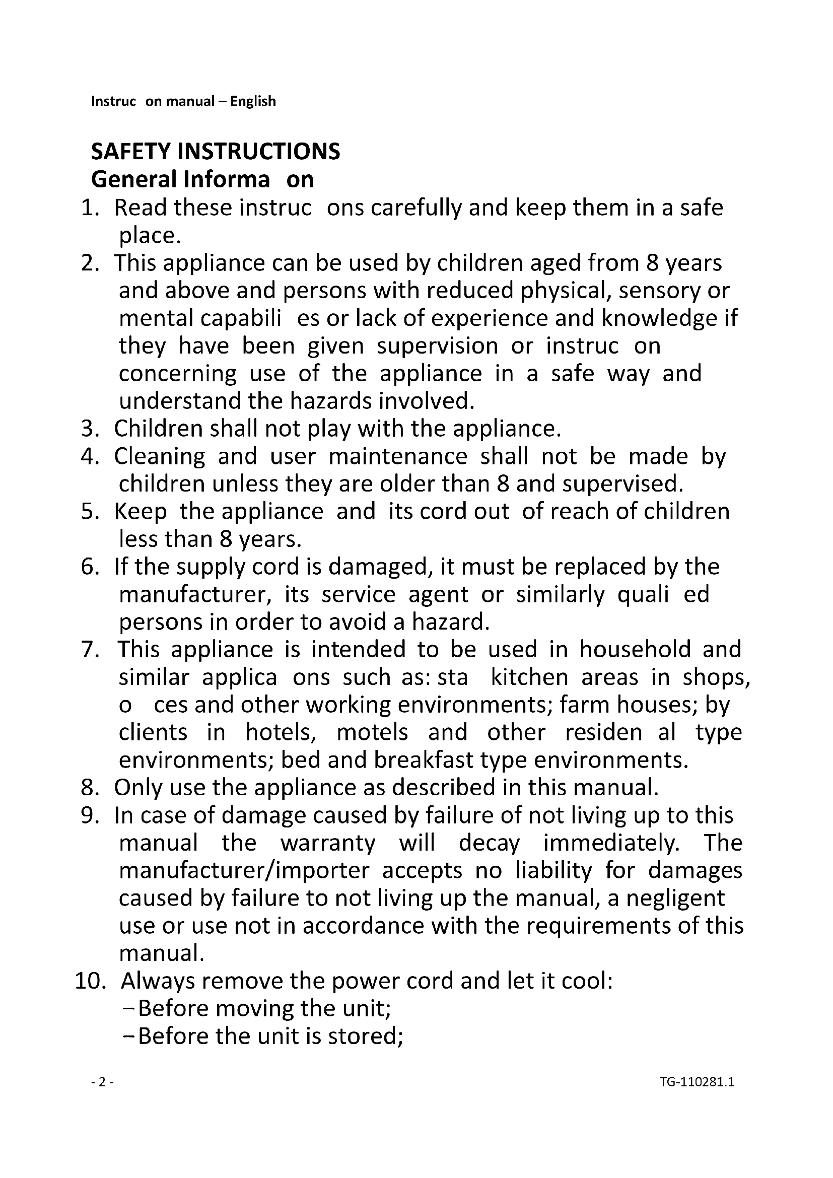 Before delivery our devices are subjected to rigorous quality control. If, despite all care, damage has occurred during production or transportation, please return the device to your dealer. In addition to statutory legal rights, the purchaser has an option to claim under the terms of the following guarantee: For the purchased device we provide 2 years guarantee, commencing from the day of sale. If you have a defective product, you can directly go back to the point of purchase. Defects which arise due to improper handling of the device and malfunctions due to interventions and repairs by third parties or the fitting of non-original parts are not covered by this guarantee. Always keep your receipt, without the receipt you can’t claim any form of warranty. Damage caused by not following the instruction manual, will lead to a void of warranty, if this results in consequential damages then we will not be liable. Neither can we hold responsible for material damage or personal injury caused by improper use if the instruction manual is not properly executed. Damage to accessories does not mean free replacement of the whole appliance. In such case please contact our service department. Broken glass or breakage of plastic parts is always subject to a charge. Defects to consumables or parts subjected to wearing, as well as cleaning, maintenance or the replacement of said parts are not covered by the warranty and are to be paid.- 7 - TG-110281.1