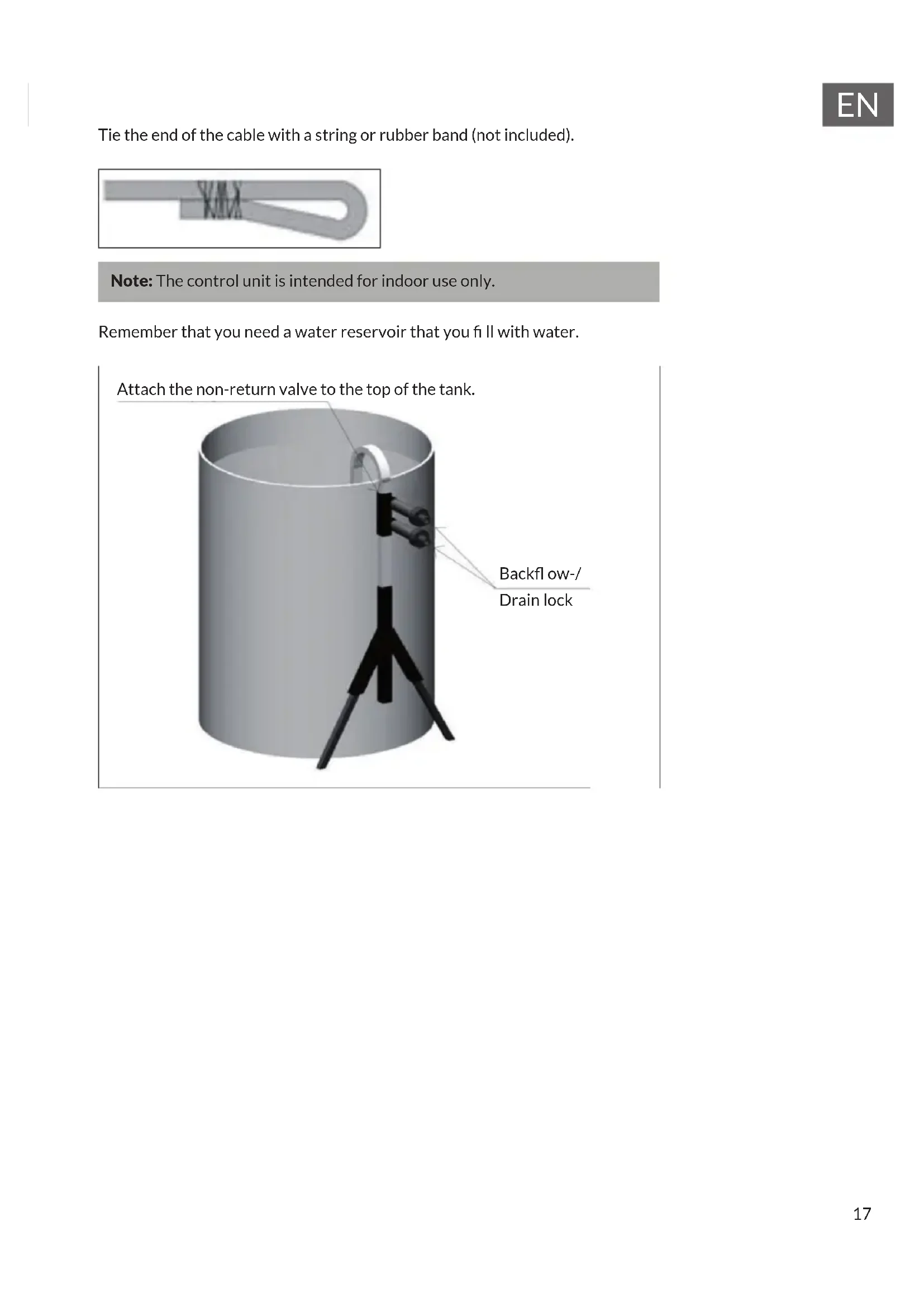 Tie the end of the cable with a string or rubber band (not included). Note: The control unit is intended for indoor use only. Remember that you need a water reservoir that you ll with water. Attach the non-return valve to the top of the tank. Back ow-/ Drain lock18