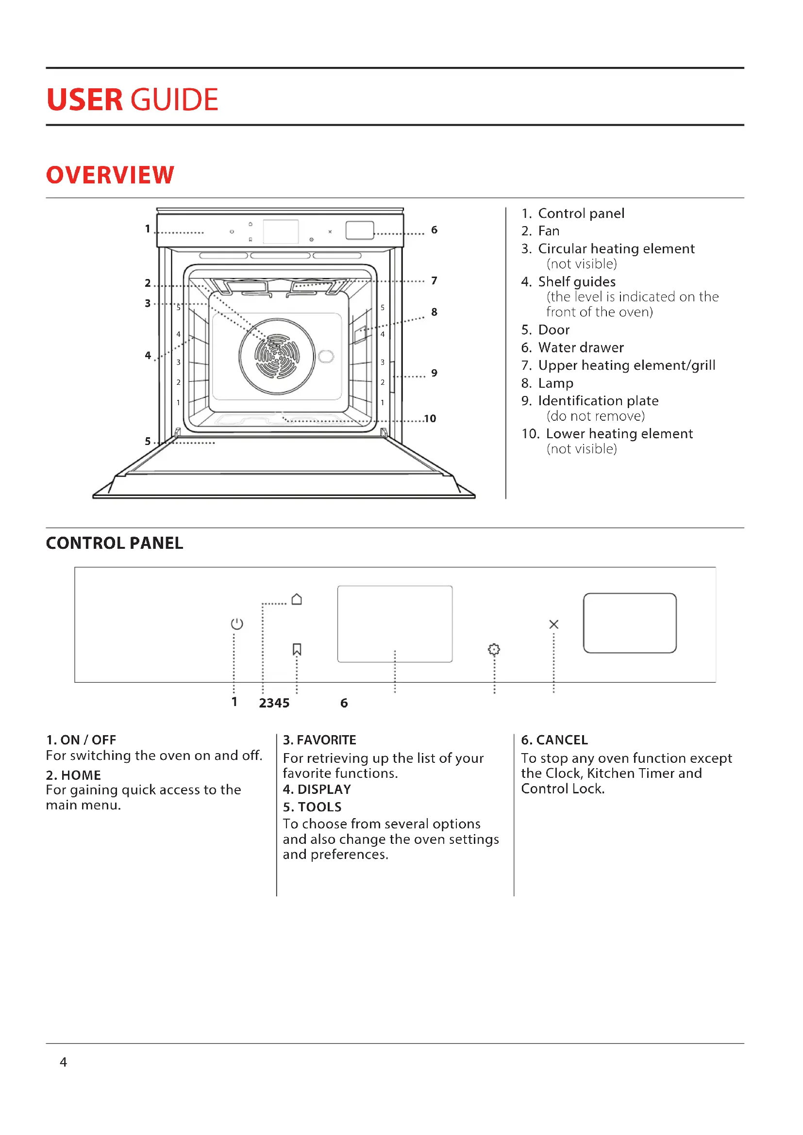 TROUBLESHOOTING 25 SUPPORT 254 1 Control panel 2 Fan 3 Circular heating element (not visible) 4 Shelf guides (the level is indicated on the front of the oven) 5 Door 6 Water drawer 7 Upper heating element/grill 8 Lamp 9 Identification plate (do not remove) 10 Lower heating element (not visible)
