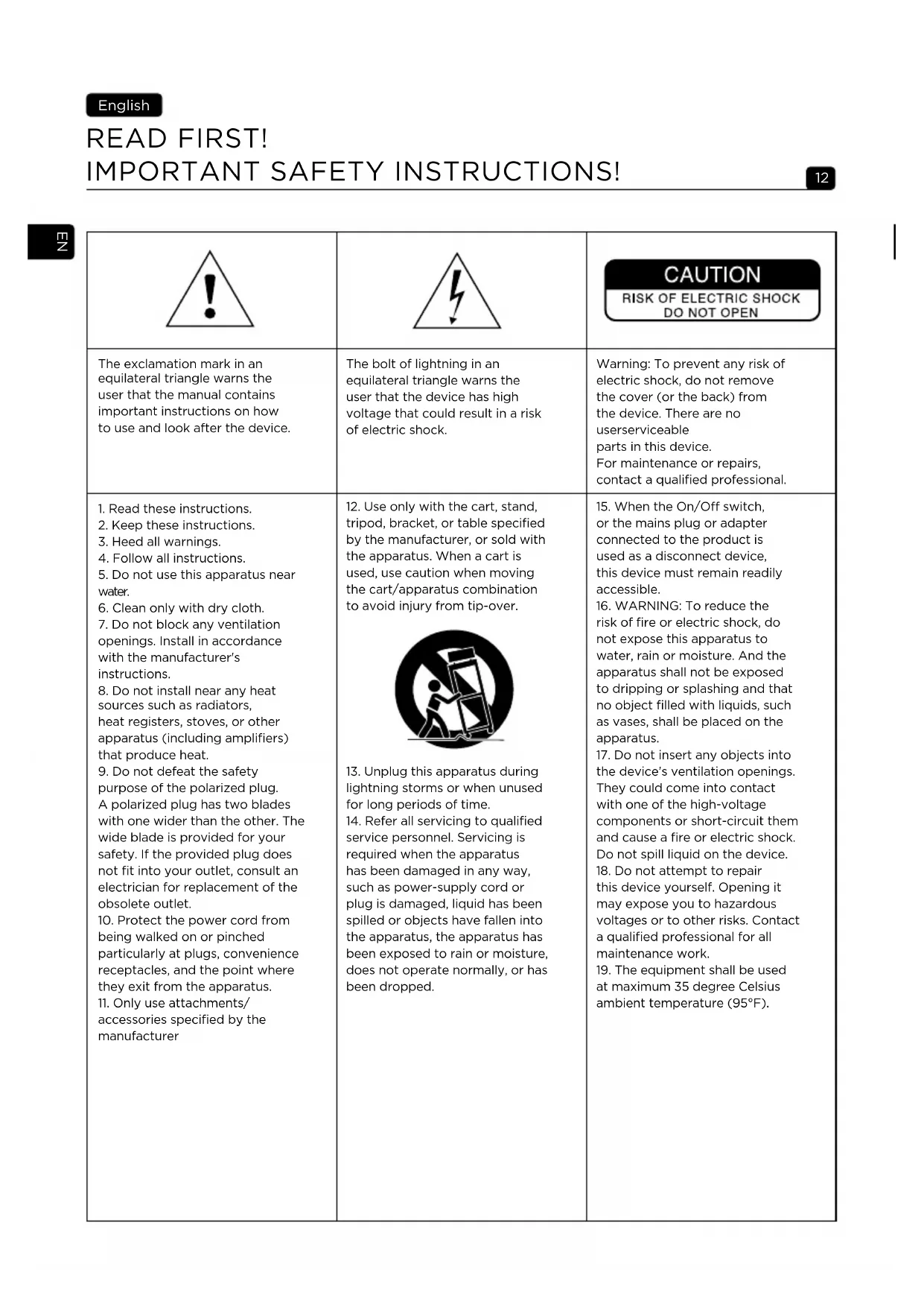 at maximum 35 degree Celsius ambient temperature (95°F). EN13 READ FIRST! IMPORTANT SAFETY INSTRUCTIONS! Our policy of continual product improvement means that Focal-JMlab reserves the right to modify the technical specifications of its products without notice. Product may vary from images. The exclamation mark in an equilateral triangle warns the user that the manual contains important instructions on how to use and look after the device. The bolt of lightning in an equilateral triangle warns the user that the device has high voltage that could result in a risk of electric shock.