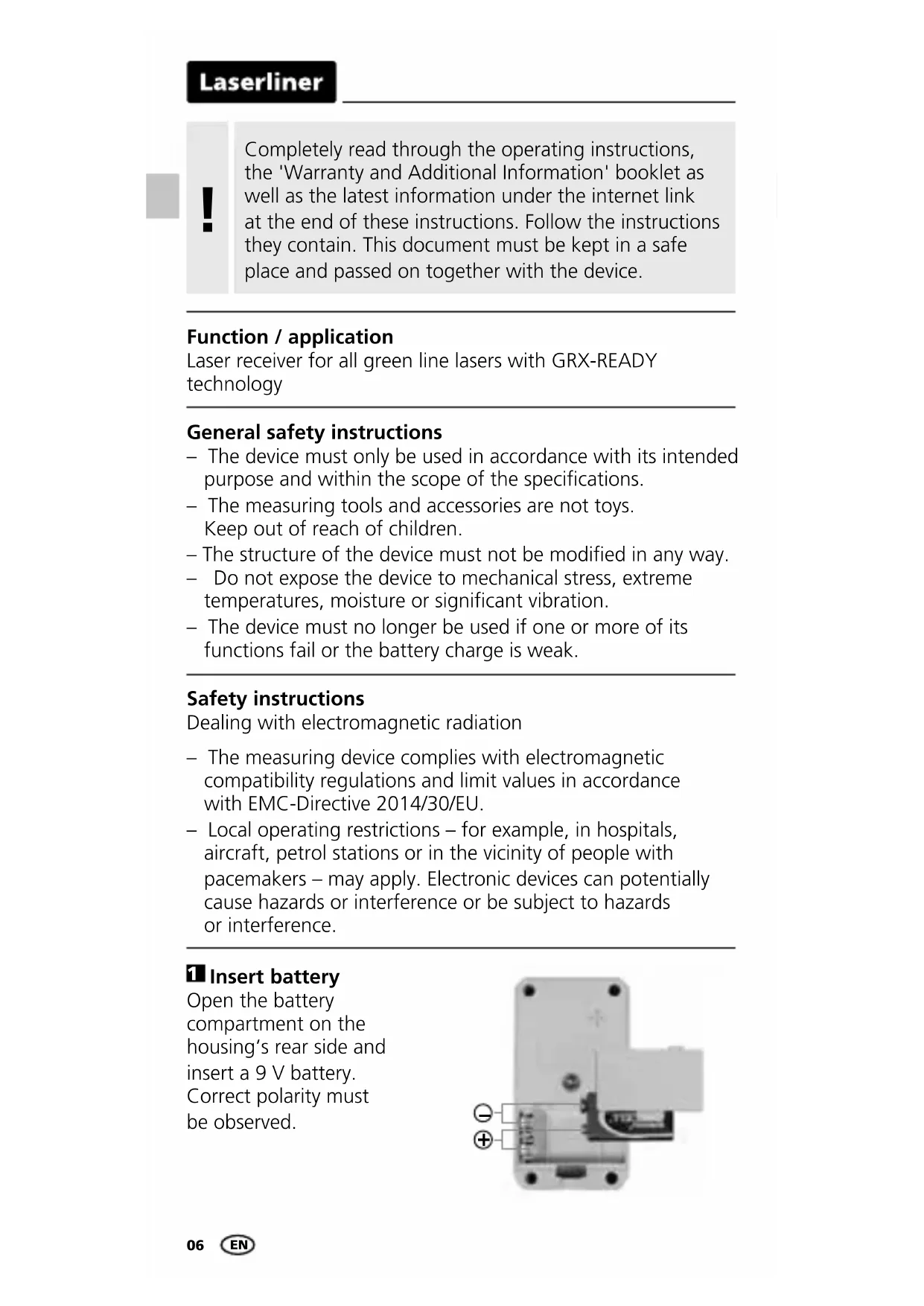 Insert battery Open the battery compartment on the housing‘s rear side and insert a 9 V battery. Correct polarity must be observed.
