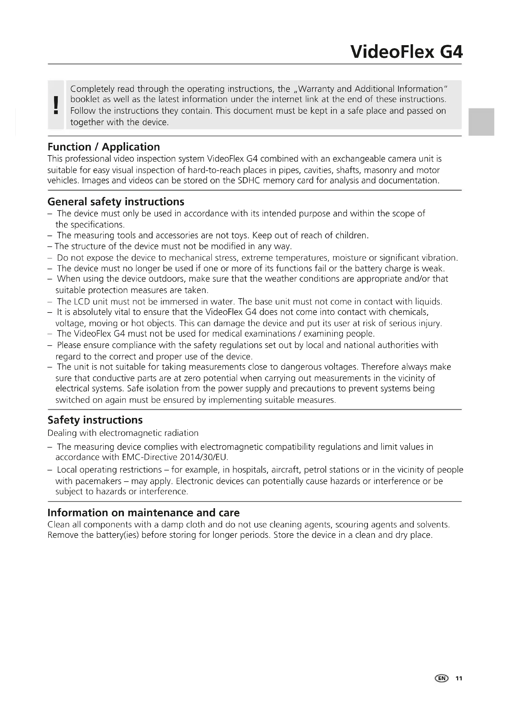 VideoFlex G4 Function / Application This professional video inspection system VideoFlex G4 combined with an exchangeable camera unit is suitable for easy visual inspection of hard-to-reach places in pipes, cavities, shafts, masonry and motor vehicles. Images and videos can be stored on the SDHC memory card for analysis and documentation. General safety instructions – The device must only be used in accordance with its intended purpose and within the scope of the specications. – The measuring tools and accessories are not toys. Keep out of reach of children. – The structure of the device must not be modied in any way. – Do not expose the device to mechanical stress, extreme temperatures, moisture or signicant vibration. – The device must no longer be used if one or more of its functions fail or the battery charge is weak. – When using the device outdoors, make sure that the weather conditions are appropriate and/or that suitable protection measures are taken. – The LCD unit must not be immersed in water. The base unit must not come in contact with liquids. – It is absolutely vital to ensure that the VideoFlex G4 does not come into contact with chemicals, voltage, moving or hot objects. This can damage the device and put its user at risk of serious injury. – The VideoFlex G4 must not be used for medical examinations / examining people. – Please ensure compliance with the safety regulations set out by local and national authorities with regard to the correct and proper use of the device. – The unit is not suitable for taking measurements close to dangerous voltages. Therefore always make sure that conductive parts are at zero potential when carrying out measurements in the vicinity of electrical systems. Safe isolation from the power supply and precautions to prevent systems being switched on again must be ensured by implementing suitable measures. Safety instructions Dealing with electromagnetic radiation – The measuring device complies with electromagnetic compatibility regulations and limit values in accordance with EMC-Directive 2014/30/EU. – Local operating restrictions – for example, in hospitals, aircraft, petrol stations or in the vicinity of people with pacemakers – may apply. Electronic devices can potentially cause hazards or interference or be subject to hazards or interference. Information on maintenance and care Clean all components with a damp cloth and do not use cleaning agents, scouring agents and solvents. Remove the battery(ies) before storing for longer periods. Store the device in a clean and dry place. EN12
