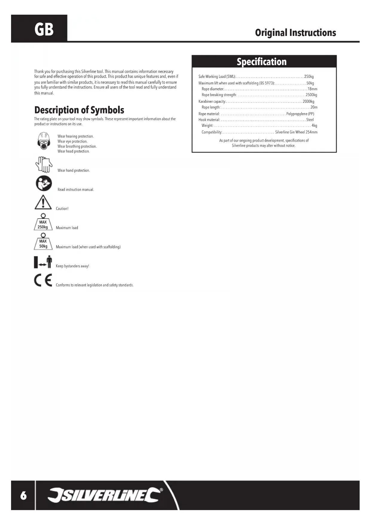 Safe Working Load (SWL):.........................................250kg Maximum lift when used with scaffolding (BS 5973):...................50kg Rope diameter:..................................................18mm Rope breaking strength: .........................................2500kg Karabiner capacity:..............................................2000kg Rope length:......................................................20m Rope material: .......................................Polypropylene (PP) Hook material: ...................................................Steel Weight: ..........................................................4kg Compatibility:............................... Silverline Gin Wheel 254mm As part of our ongoing product development, specications of Silverline products may alter without notice. SpecicationIntroduction Thank you for purchasing this Silverline tool. This manual contains information necessary for safe and effective operation of this product. This product has unique features and, even if you are familiar with similar products, it is necessary to read this manual carefully to ensure you fully understand the instructions. Ensure all users of the tool read and fully understand this manual. Original Instructions Description of Symbols The rating plate on your tool may show symbols. These represent important information about the product or instructions on its use.Wear hearing protection. Wear eye protection. Wear breathing protection.Wear head protection.Wear hand protection.Read instruction manual.Caution!Maximum load Maximum load (when used with scaffolding)Keep bystanders away!Conforms to relevant legislation and safety standards. MAX 250kg MAX 50kg 865628_Manual.indd 6 19/07/2018 14:41Gin Wheel Rope with Hook 865628