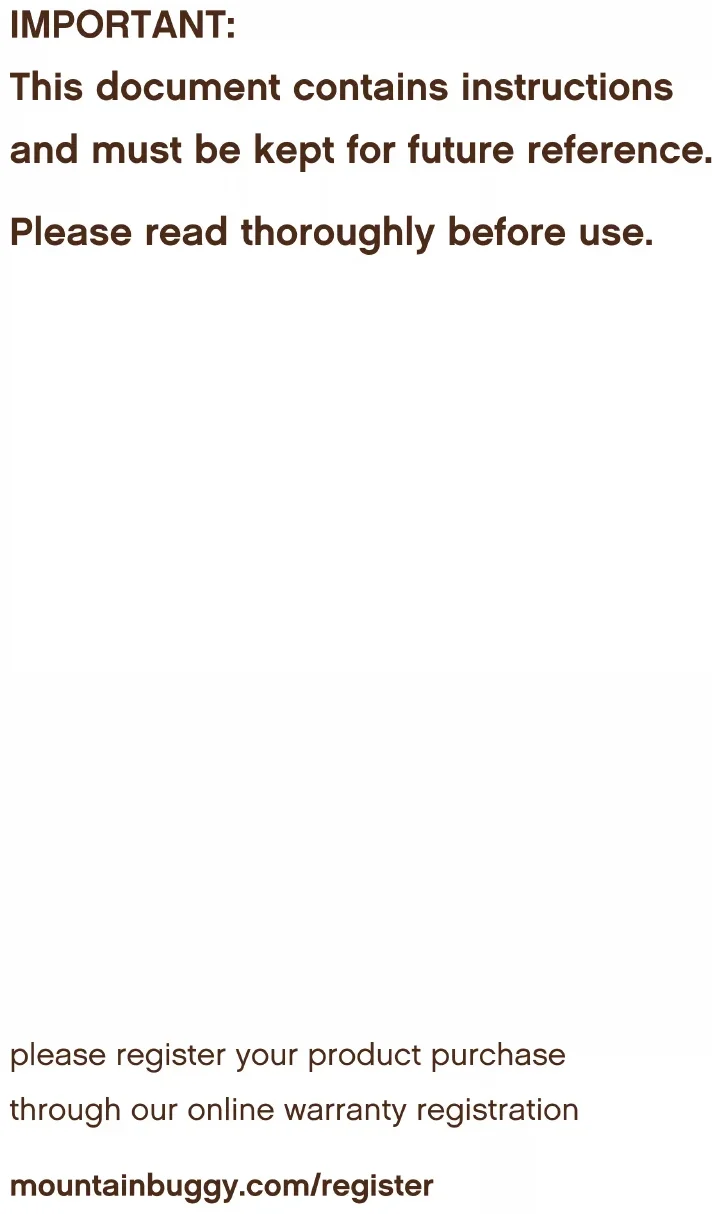 instructionsIMPORTANT: This document contains instructions and must be kept for future reference. Please read thoroughly before use. please register your product purchase through our online warranty registration mountainbuggy.com/register3 share your juno experience by finding us on facebook facebook.com/lifewithoutlimitfor safety reasons, please check your juno and infant insert for any signs of damage before use. if the fabric is torn, the seams ripped or the fastenings flawed, please consult our web support (mountainbuggy.com/ support). from here you can contact a local customer team member. care information caring for juno