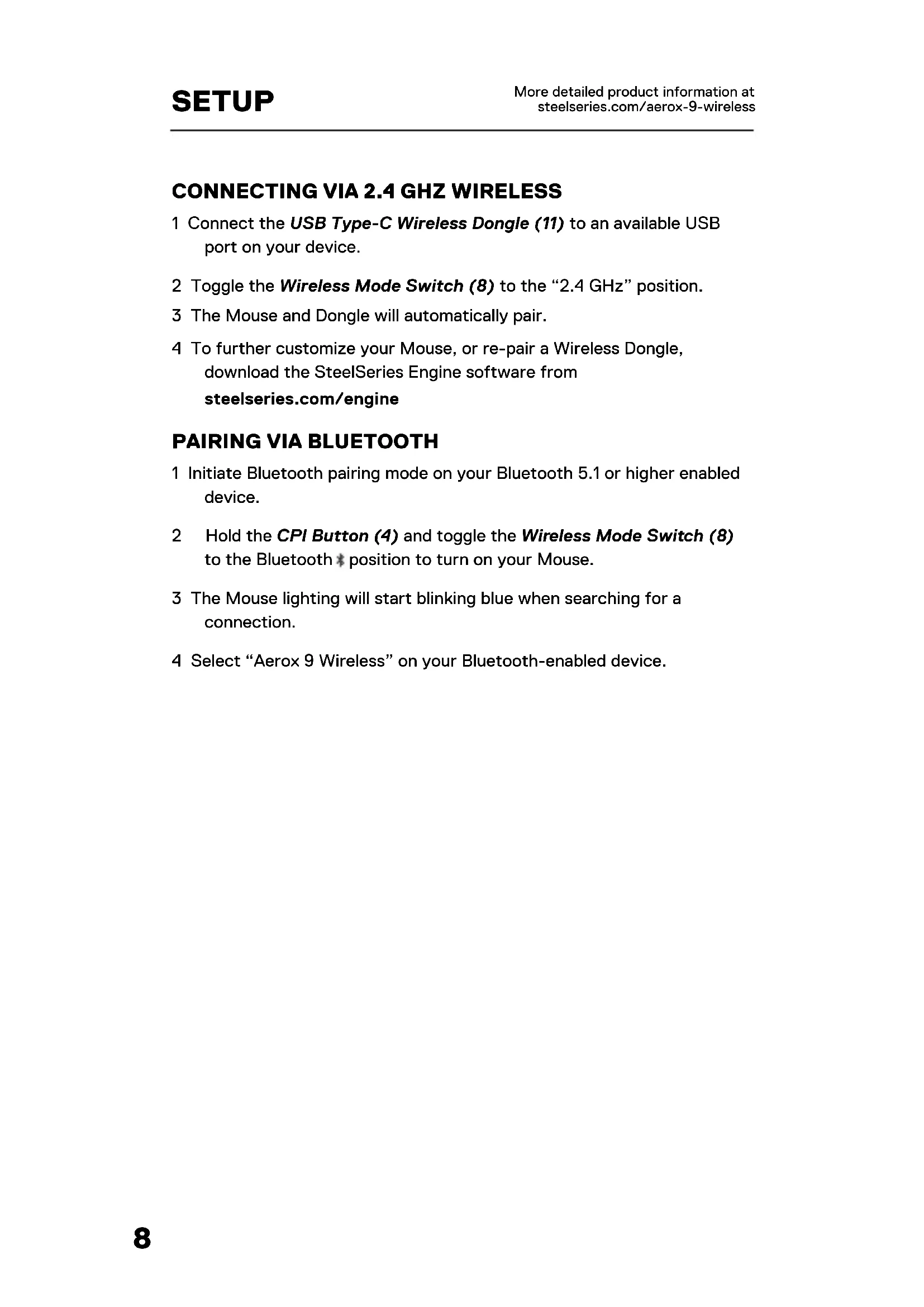1 Initiate Bluetooth pairing mode on your Bluetooth 5.1 or higher enabled device. 2 Hold the CPI Button (4) and toggle the Wireless Mode Switch (8) to the Bluetooth position to turn on your Mouse. 3 The Mouse lighting will start blinking blue when searching for a connection. 4 Select “Aerox 9 Wireless” on your Bluetooth-enabled device. More detailed product information at steelseries.com/aerox-9-wireless9