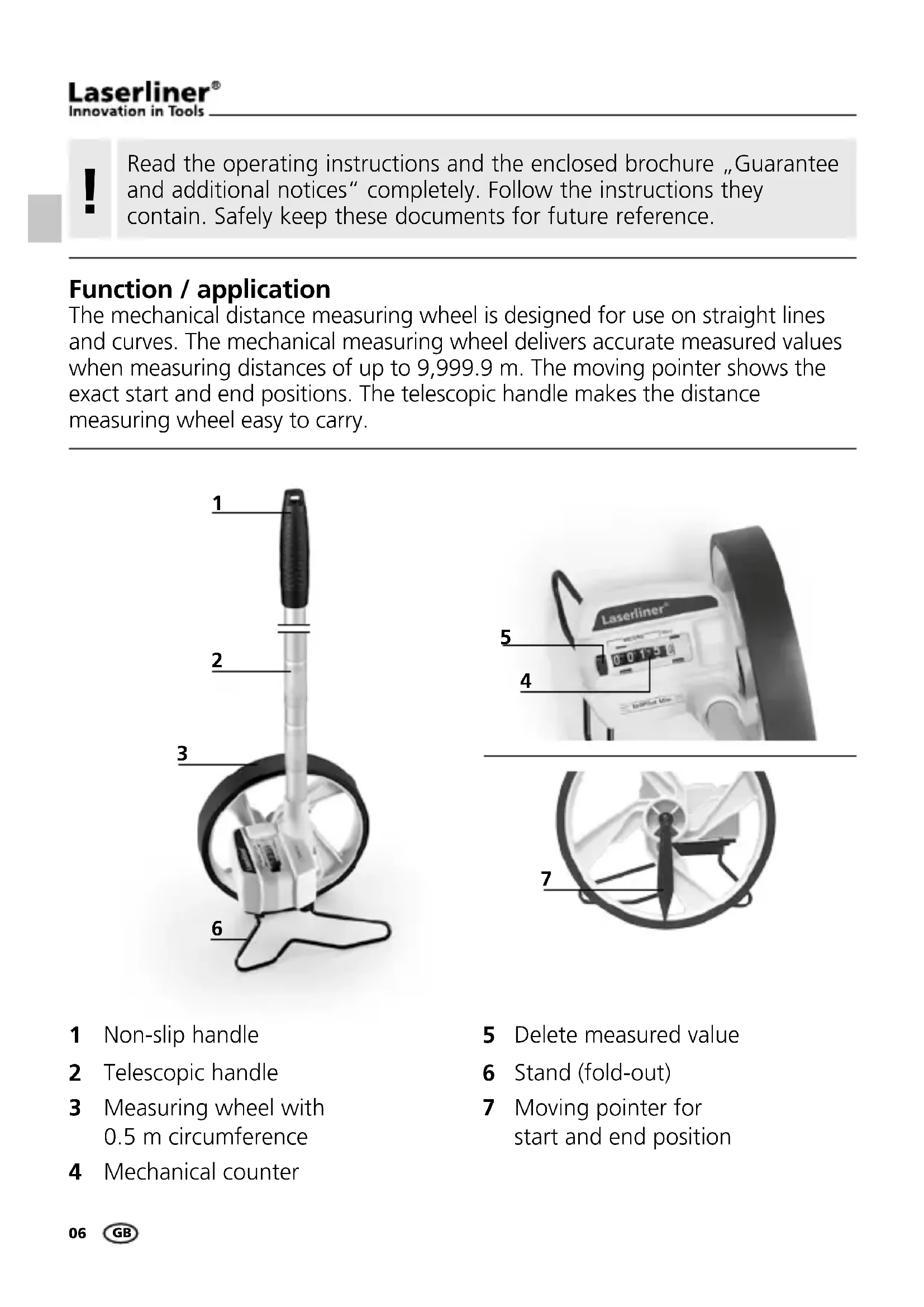 Function / application The mechanical distance measuring wheel is designed for use on straight lines and curves. The mechanical measuring wheel delivers accurate measured values when measuring distances of up to 9,999.9 m. The moving pointer shows the exact start and end positions. The telescopic handle makes the distance measuring wheel easy to carry. Non-slip handle Telescopic handle Measuring wheel with
