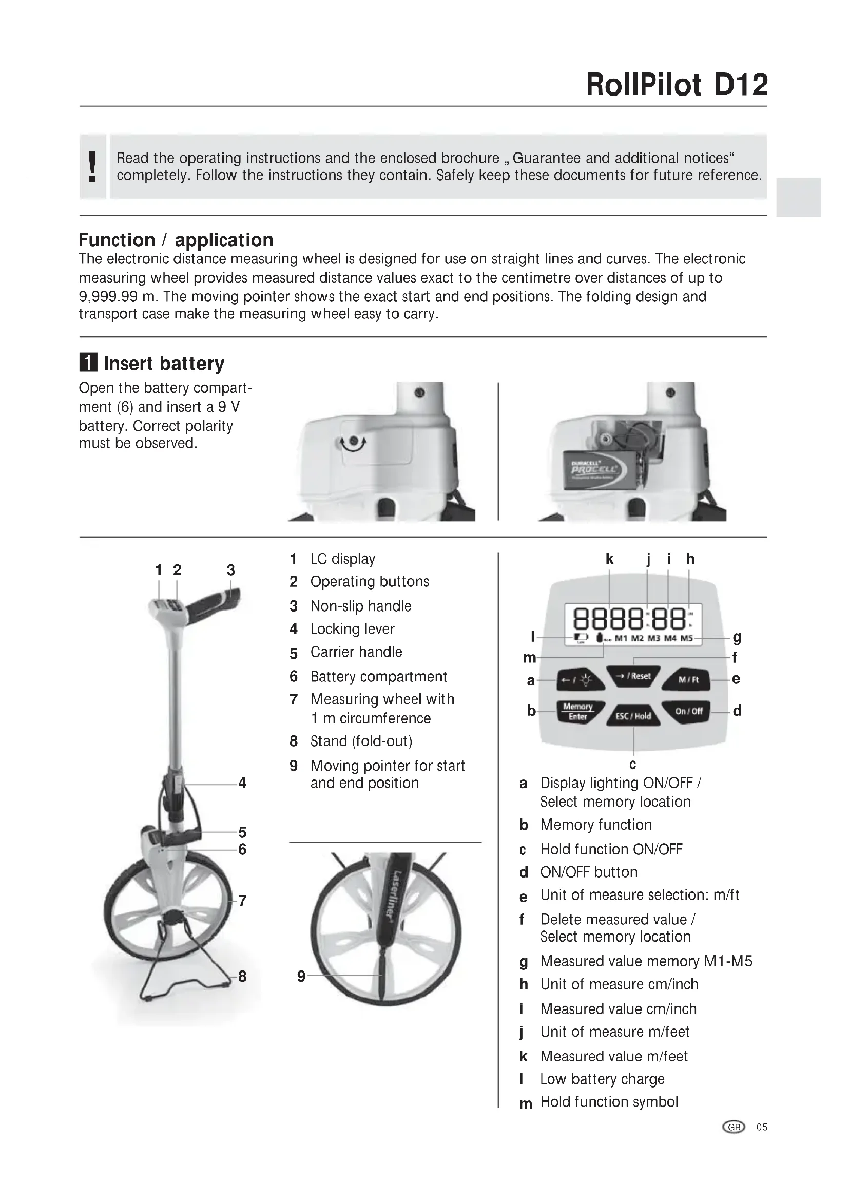 Function / application The electronic distance measuring wheel is designed for use on straight lines and curves. The electronic measuring wheel provides measured distance values exact to the centimetre over distances of up to 9,999.99 m. The moving pointer shows the exact start and end positions. The folding design and transport case make the measuring wheel easy to carry. Open the battery compart- ment (6) and insert a 9 V battery. Correct polarity must be observed. Insert battery LC display Operating buttons Non-slip handle Locking lever Carrier handle Battery compartment Measuring wheel with 1 m circumference Stand (fold-out) Moving pointer for start and end position
